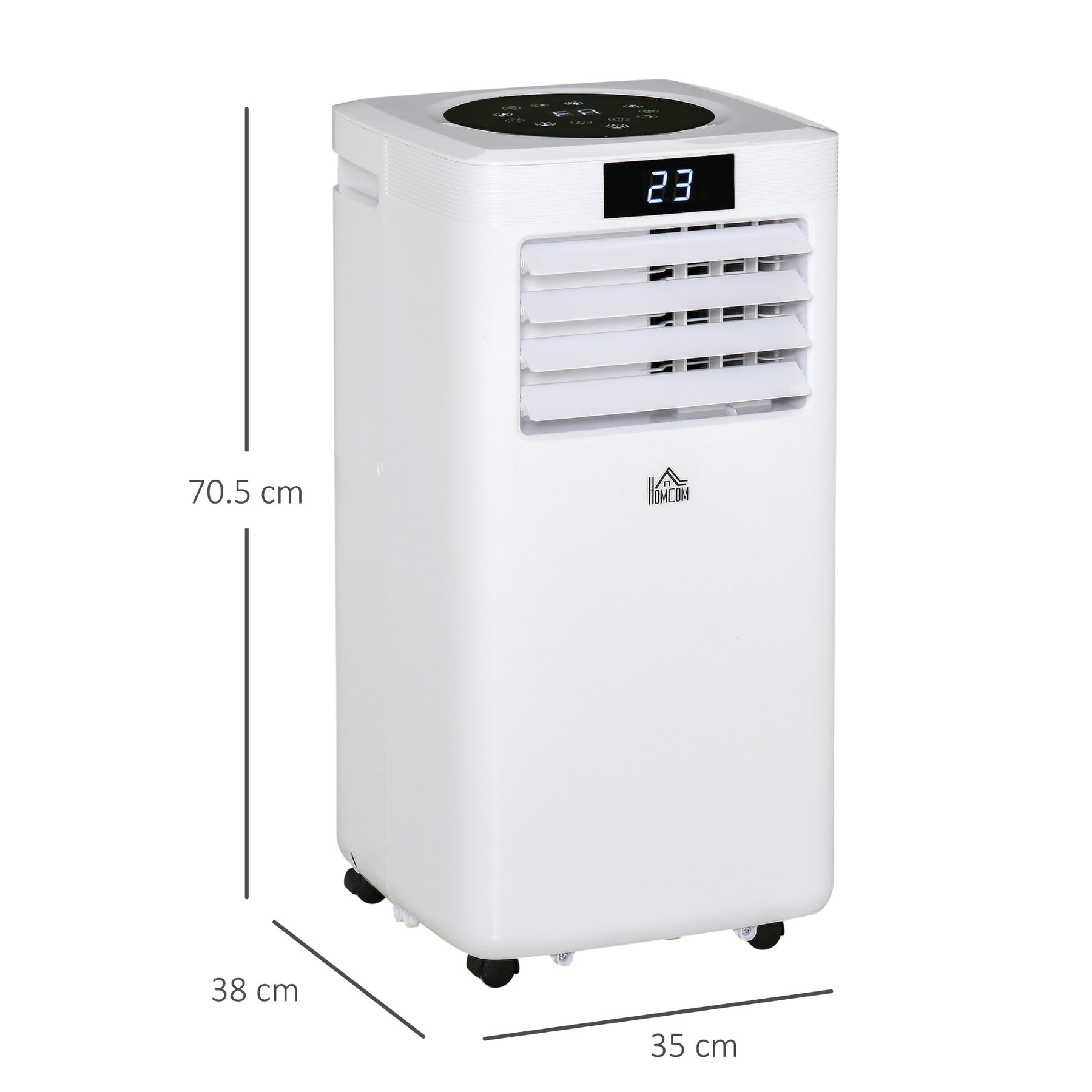 Whatever the space, it's easy to keep cool with this portable air conditioning unit, from . Over 3-in-1 function - cool, dehumidify, fan - you are able to pick the most comfortable breeze for you. The two speeds also mean you can have it blowing slow or fast; the air output can be changed up or down to cover the area you want it to. With an LED screen and remote included, you can change the settings wherever you stand - how easy is that! Complete with four roller wheels.