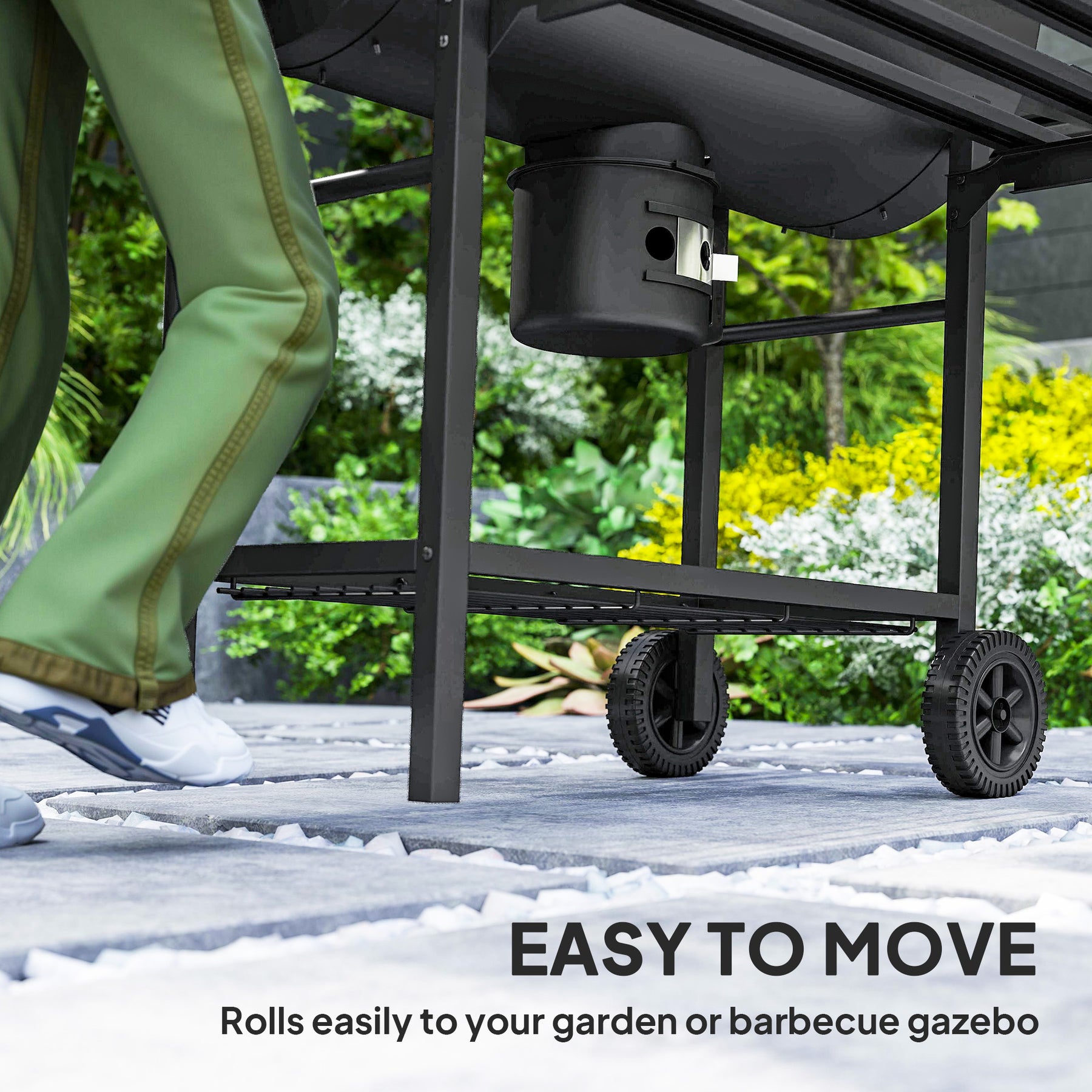- Wheels and side handle enable convenient mobility across the garden