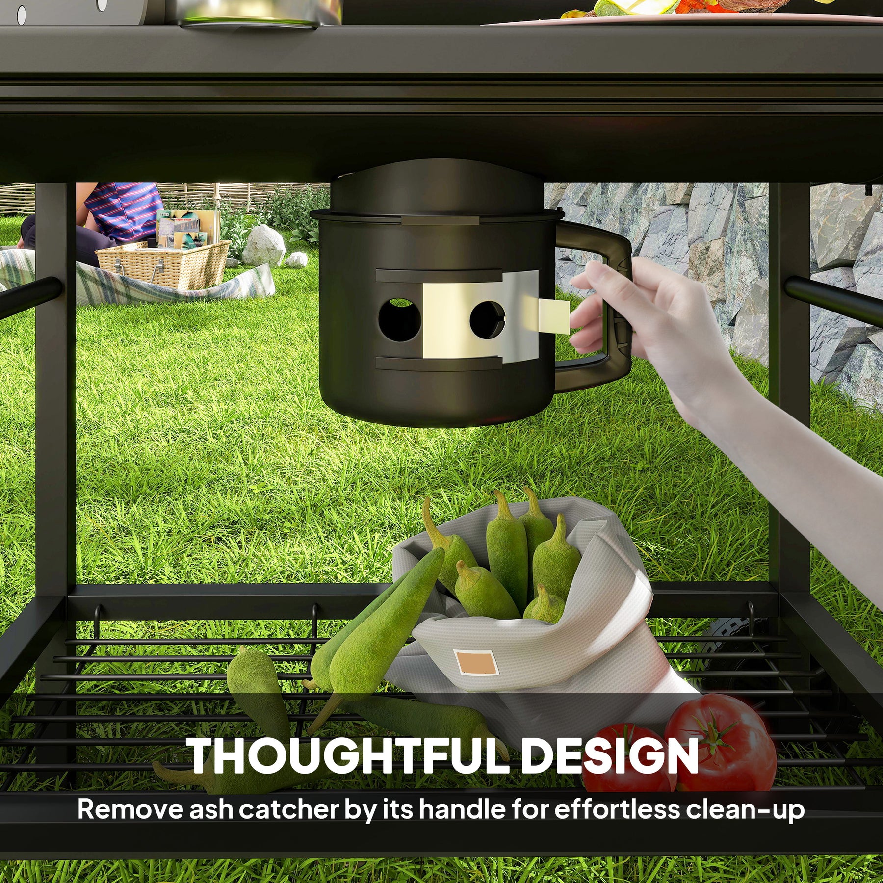 - Removable ash catcher with a handle for effortless clean-up