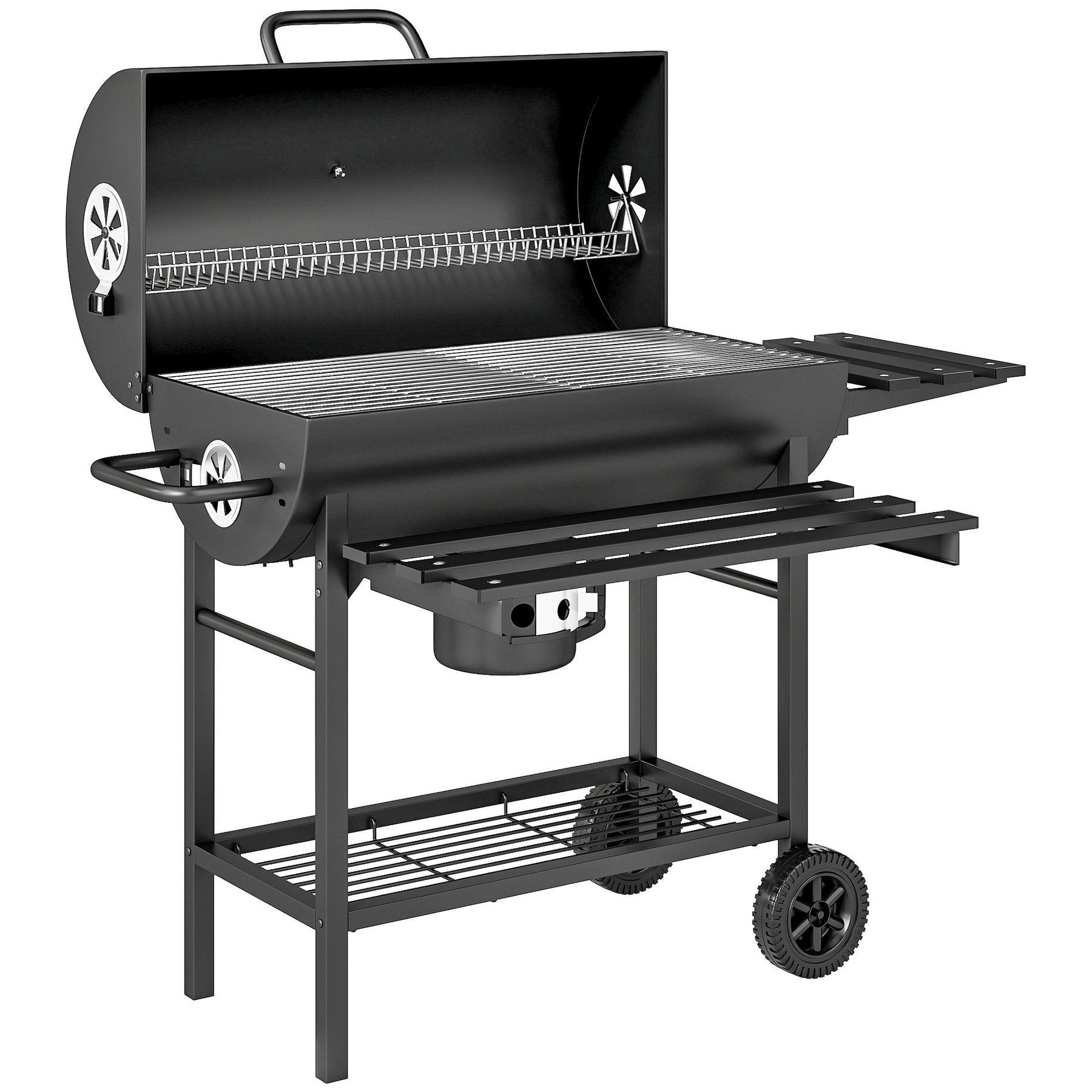 Fire up the fun with the barrel barbecue grill— your essential companion for sizzling, flavour-packed cookouts! It has a spacious grilling area and effortlessly cooks up to 8 burger patties and 10 sausages. Take control of your BBQ experience with the adjustable side vents and a built-in thermometer, ensuring precision heat management for perfectly grilled delights every time. Get ready to grill like a pro!