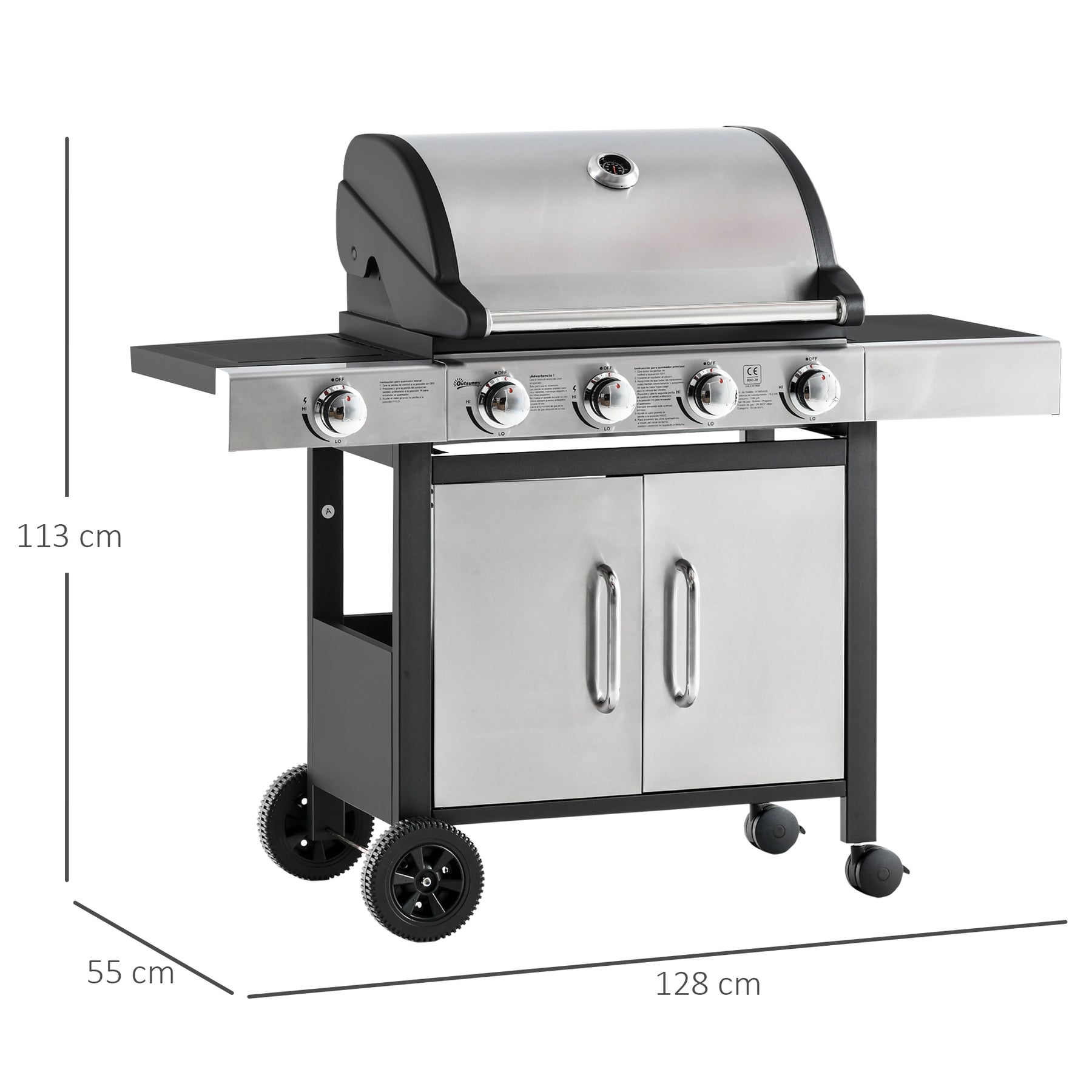 MCL Gas Barbecue Grill 4+1 Burner Garden Smoker BBQ Trolley w/ Side Burner Warming Rack Side Shelves Storage Cabinet Piezo Ignition Thermometer Stainless Steel + Metal