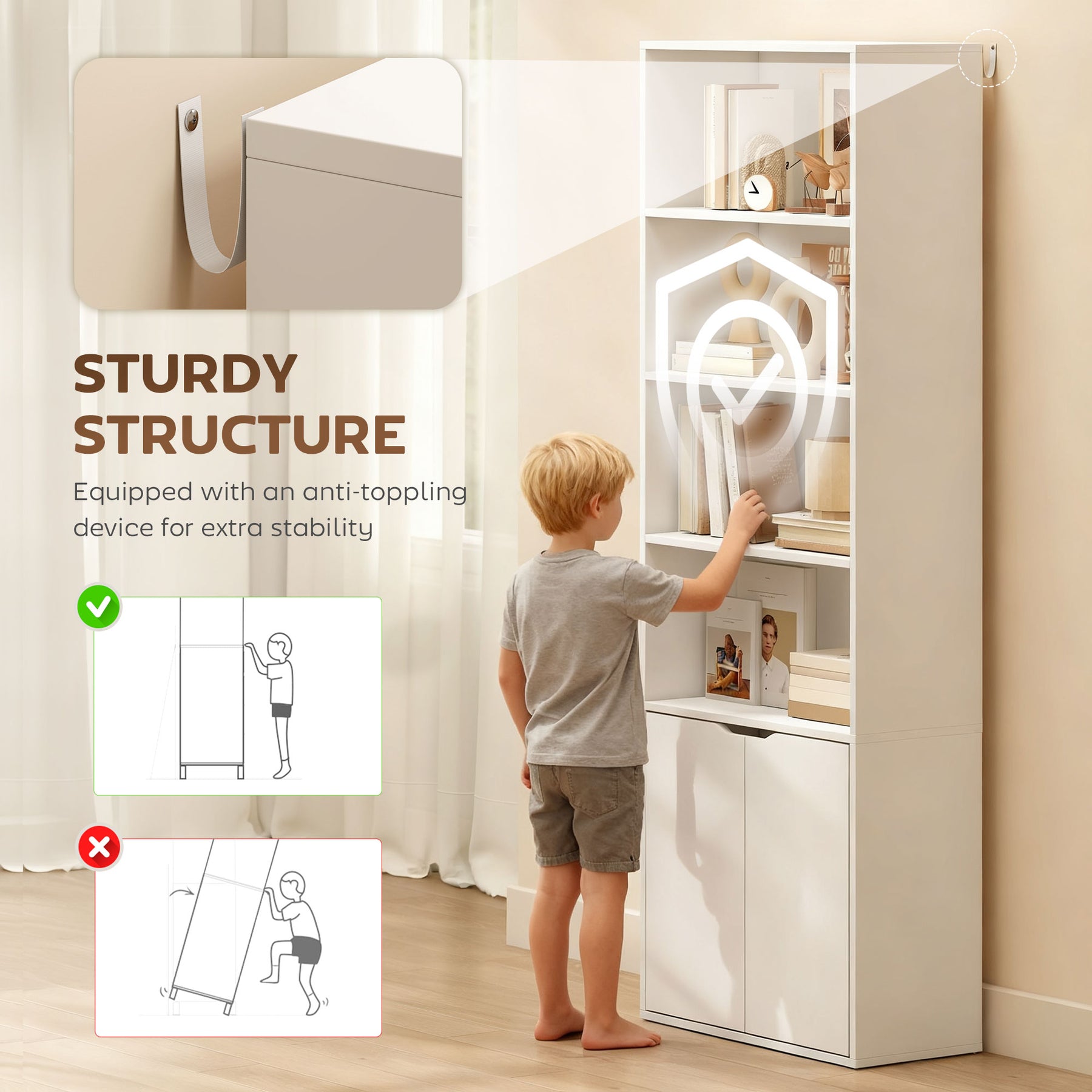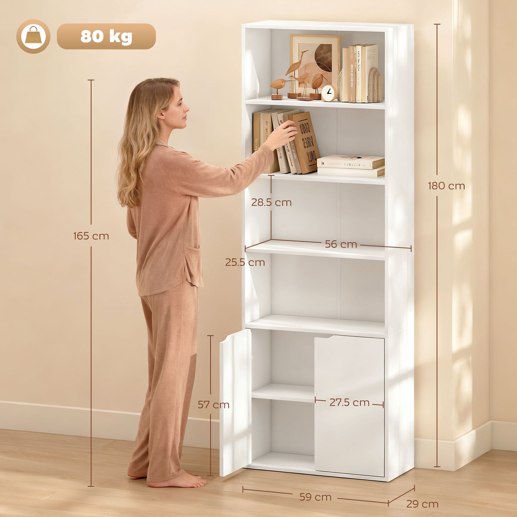 MCL 6-Tier Tall Bookcase, Bookshelf with 4 Open Shelves and Double Door Storage Cabinet, Freestanding Display Rack for Living Room, Bedroom, Home Office, Study, 59 x 29 x 180cm, White