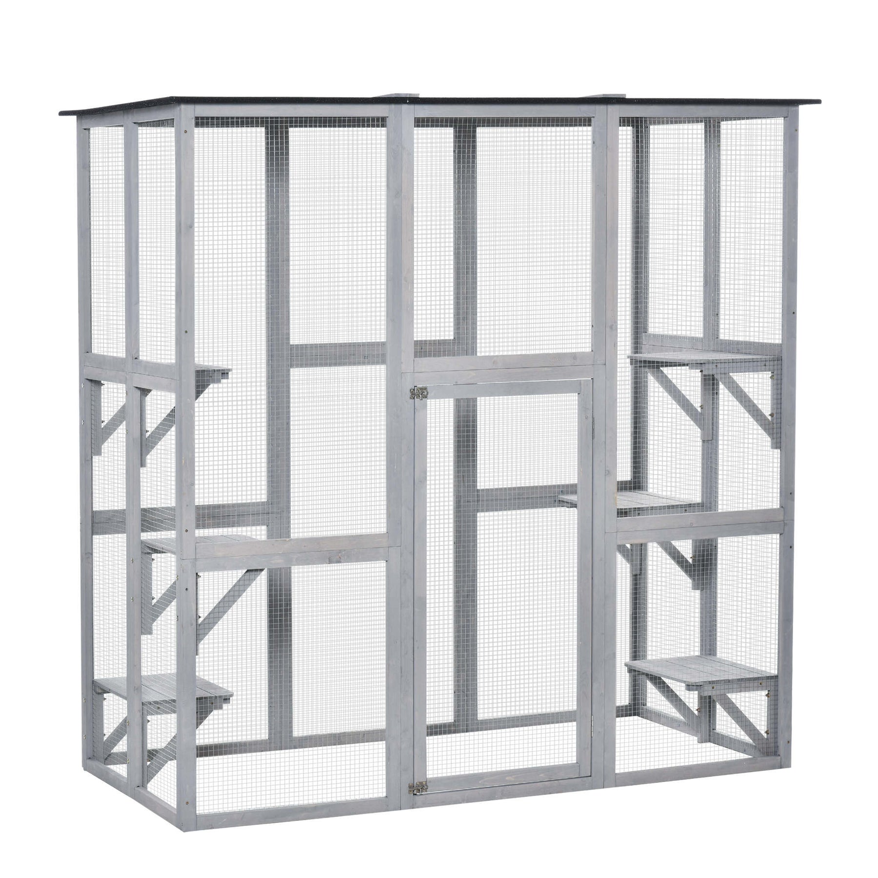 MCL Wooden Catio Cat Outdoor Enclosure, Cat Cage with Waterproof Roof, Platforms, for Multiple Kittens, 180 x 98 x 180 cm