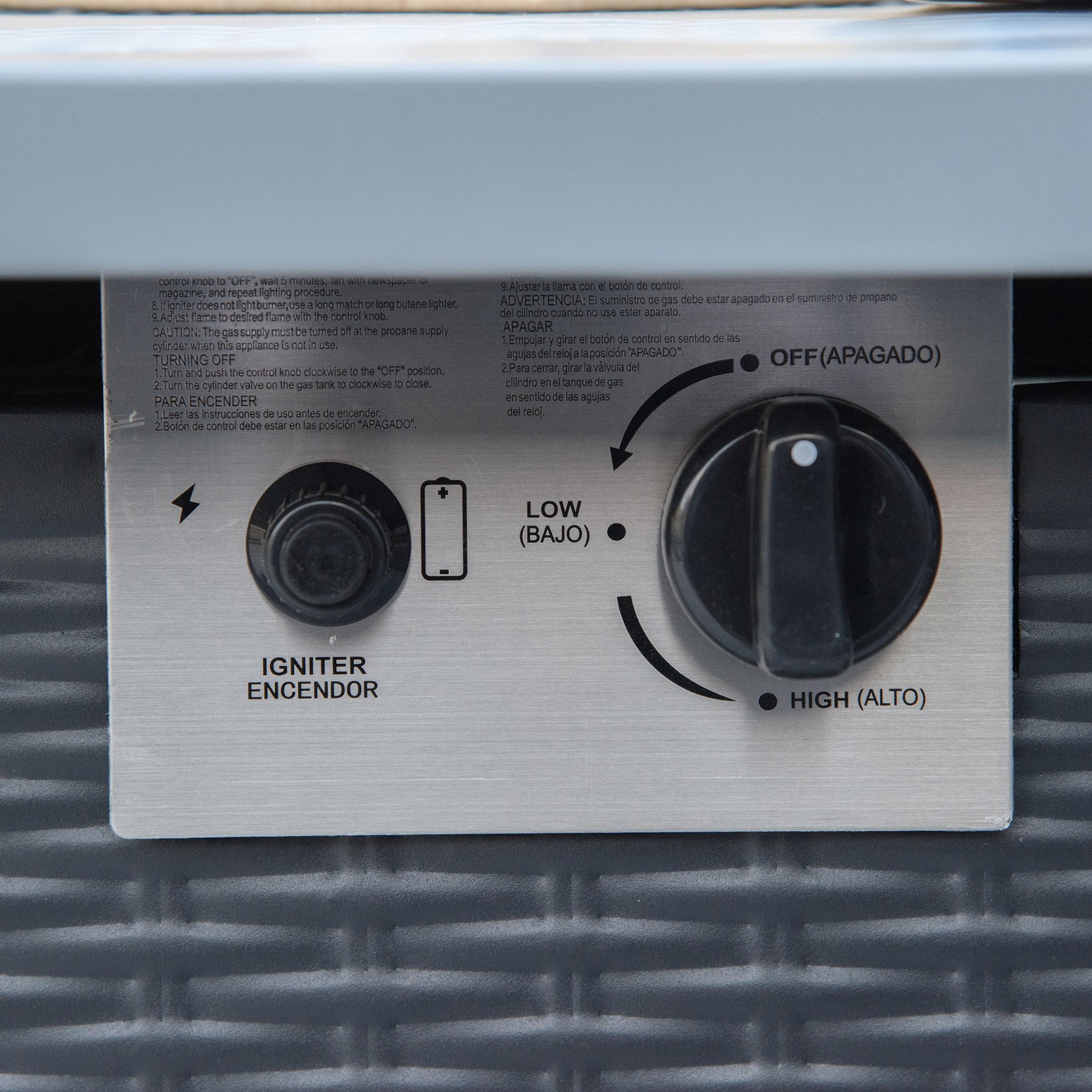 Enjoy garden warmth and ambiance all year-round with this MCL fire pit table. The rattan-effect design is stylish, looks great matched with other furniture. The tabletop is fitted with a centre fire pit - the 40,000 BTU burner is powerful and produces a clean smokeless burn. The flame can be adjusted too. The thermocouple closes the valve if the flame goes out for safety - no leaking gas. Lid included to turn into a standard table when needed.