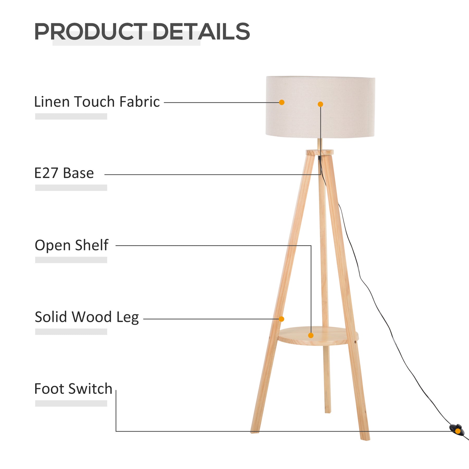 MCL Tripod Floor Lamp, Freestanding Bedside Light Reading Light with Storage Shelf and Linen Shade for Living Room Bedroom, 154cm, Cream