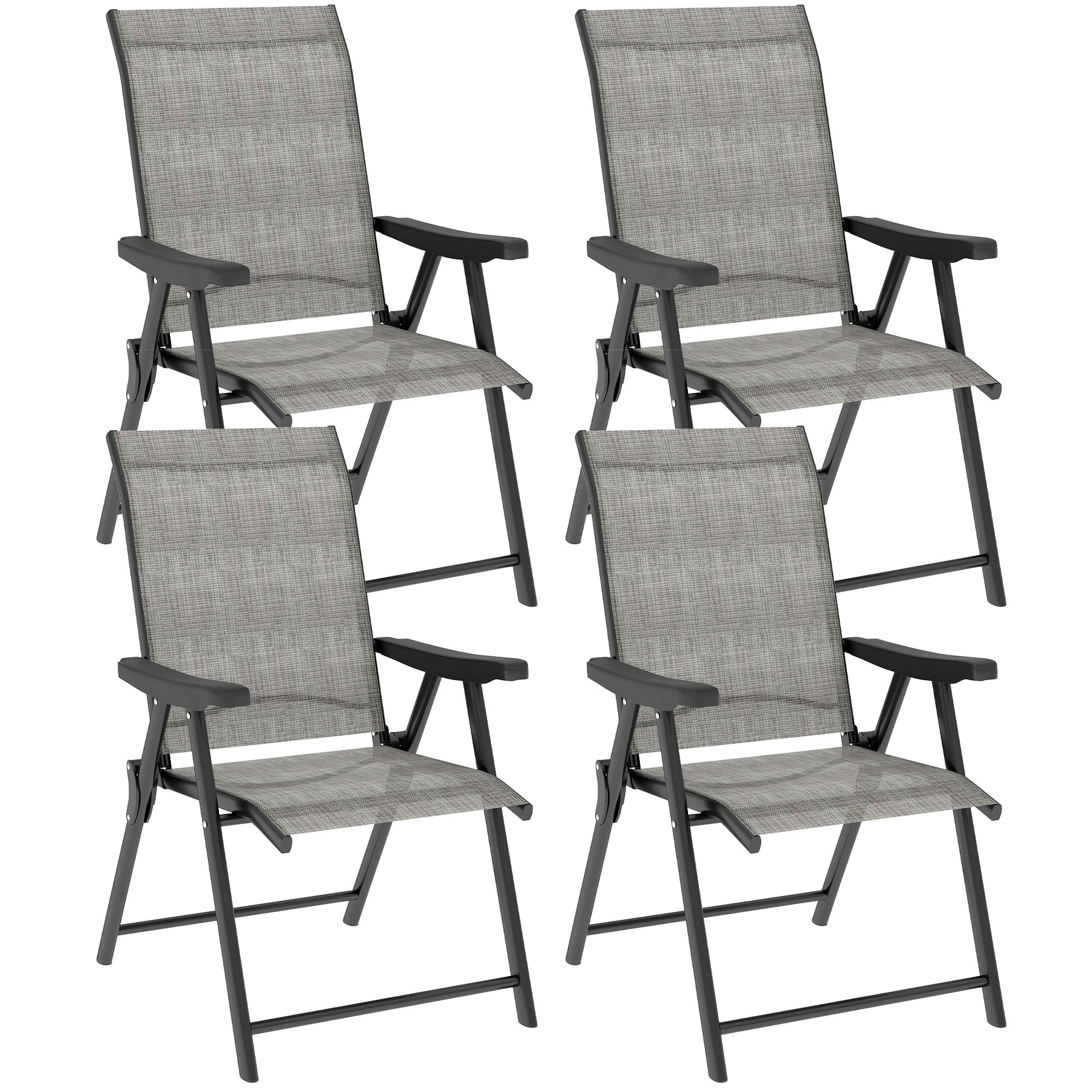 An essential set for garden and outdoor spaces - these four outdoor chairs. With 63 cm high backs and armrests for support, the breathable mesh fabric seats hold you comfortably. Using powder coated steel frames for a strong core, these chairs are foldable - carry around and store whenever you want