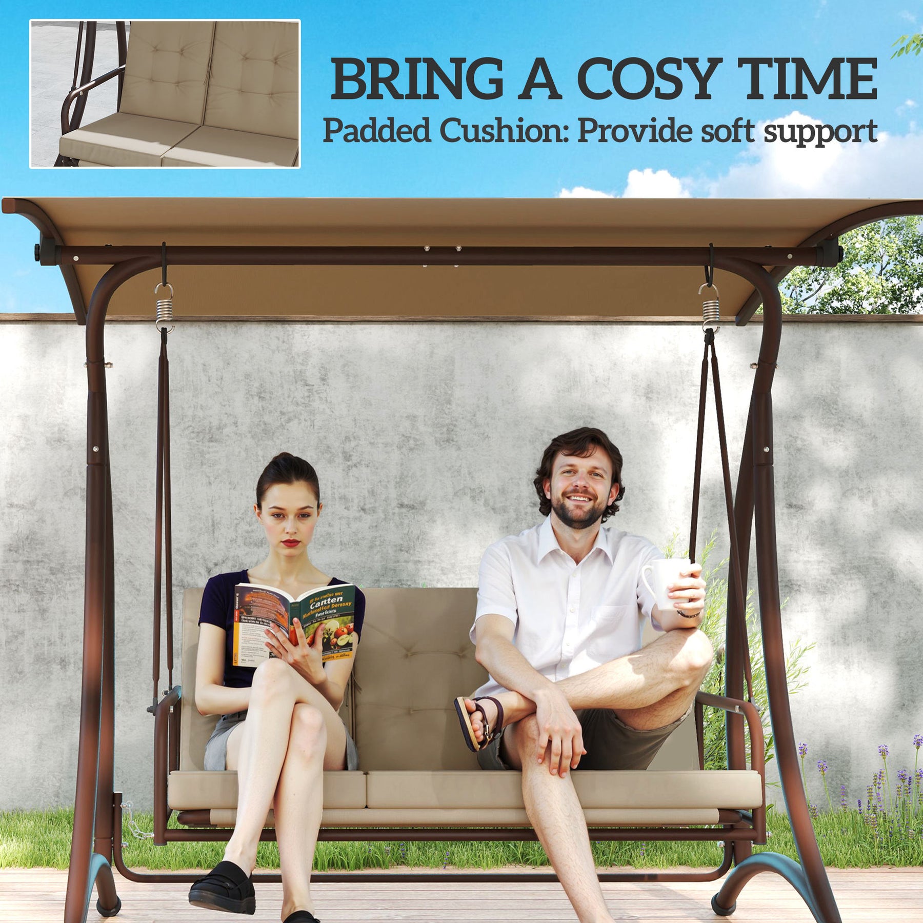 - Converts between three-seater swing bench, into a bed. Relax your way
