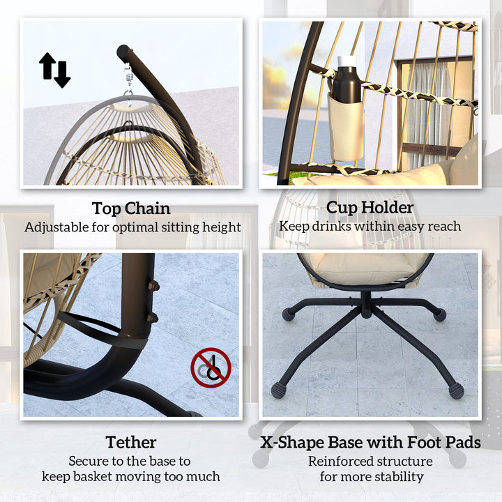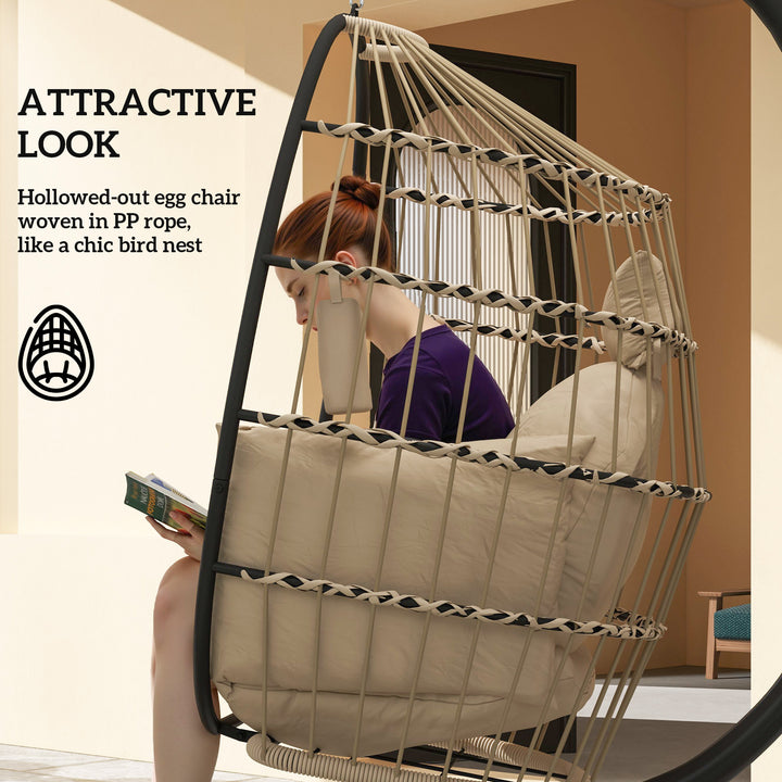 Relax in optimal comfort with this outdoor egg chair from ! This egg garden chair with a hollowed-out design woven in ropes is like a cosy bird-nest retreat. The folding basket allows easy storage, with a cup holder keeping your drink close. 20cm thickened cushion with armrests and a separate head pillow offer luxurious comfort. Powder-coated steel frame and X-shape base mean a stable swinging egg chair. Adjustable top chain customises your swinging experience.