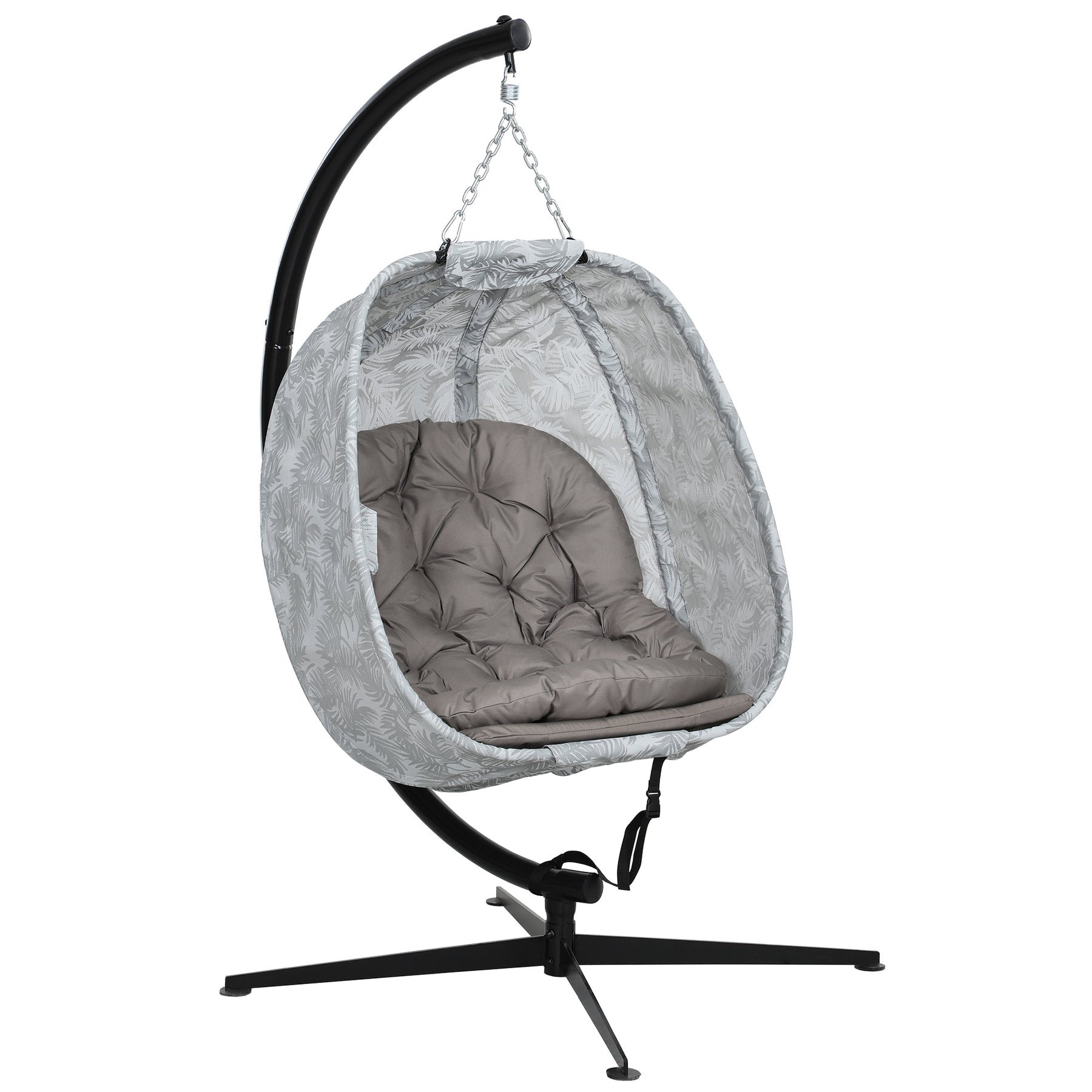 Relax in optimal comfort with this outdoor egg chair from ! With a wide seat covered in feathery leaves pattern texteline fabric, this egg garden chair offers cosy, bird-nest-like retreat. The folding basket allows easy storage, with a cup holder keeping your drink close. A large 13 cm thickened cushion and a bottom cushion offer cloud-like comfort. Powder-coated steel frame and X-shaped base mean a stable swinging egg chair. Adjustable top chains customise your swinging experience.