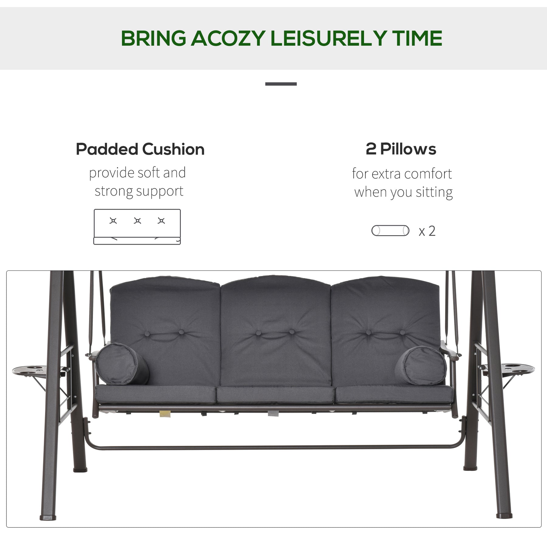 MCL 3 Seater Garden Swing Chair Outdoor Hammock Bench w/ Adjustable Canopy, Cushions and Cup Trays, Brown Steel Frame, Dark Grey Fabric