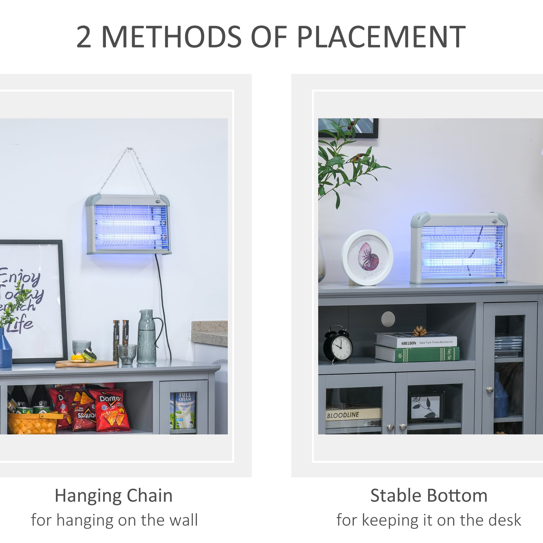 This portable bug killer lamp is energy-efficient, non-radiative, noiseless and odourless; protects against mosquitoes, flies and other pests. The front protective screen protects you from touching inside, avoiding accidental electric shocks. The removable collection tray makes cleaning easy. 20W power and 60㎡ room coverage. Mount on the wall, or hang with included chain.
