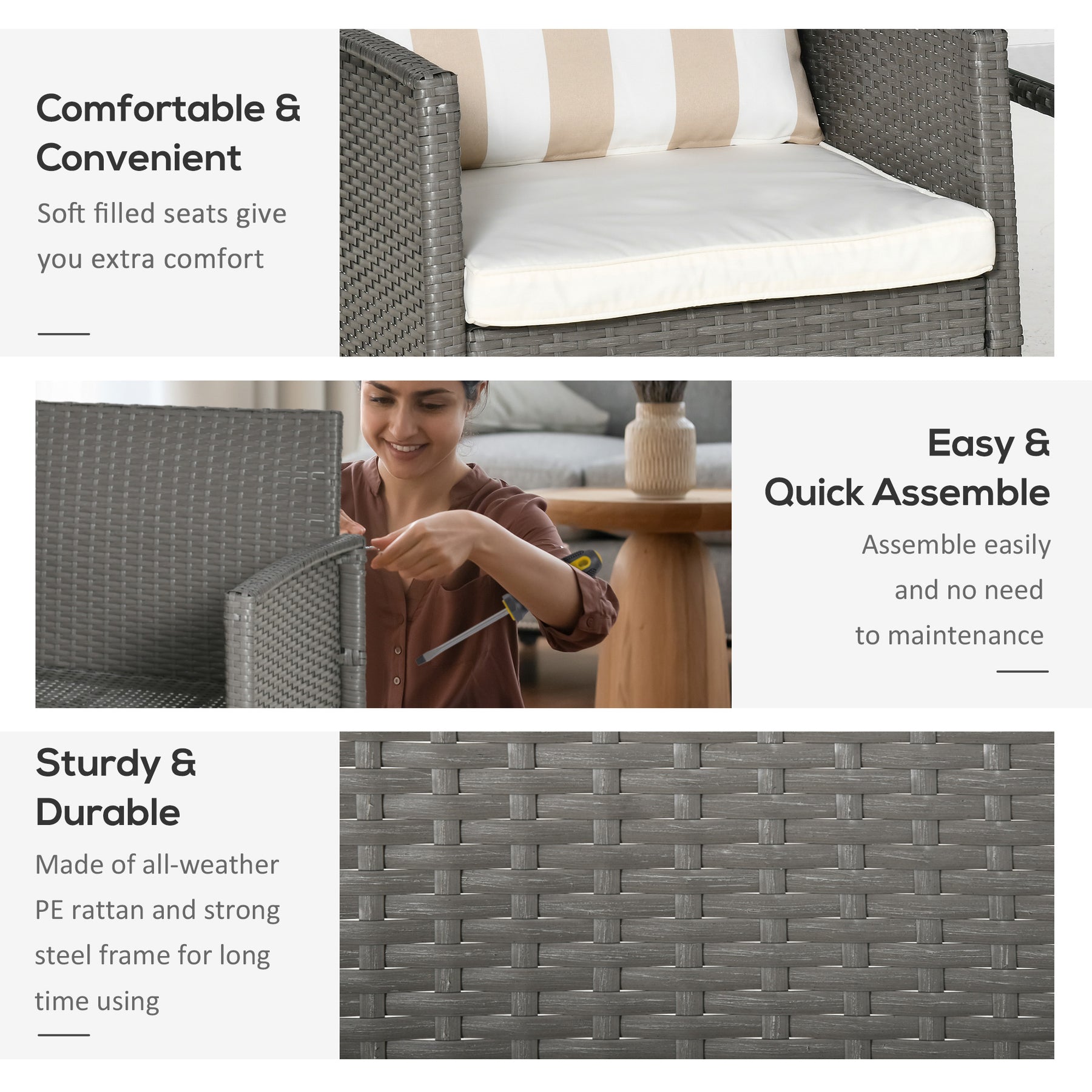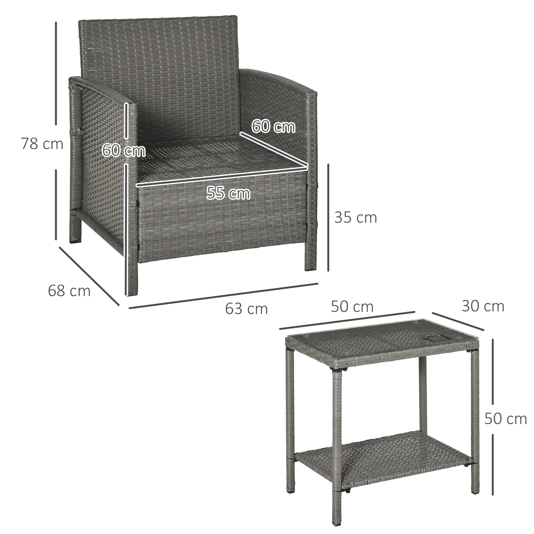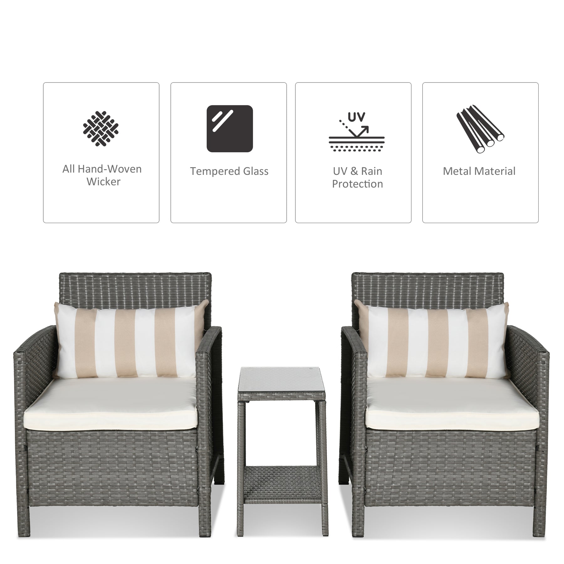 MCL 3 Pieces Rattan Bistro Set, Wicker Garden Furniture Set, Glass Top 2-tier Coffee Table and Chairs Set with Pillows and Washable Cushions for Outdoor, Patio, Balcony, Light Grey
