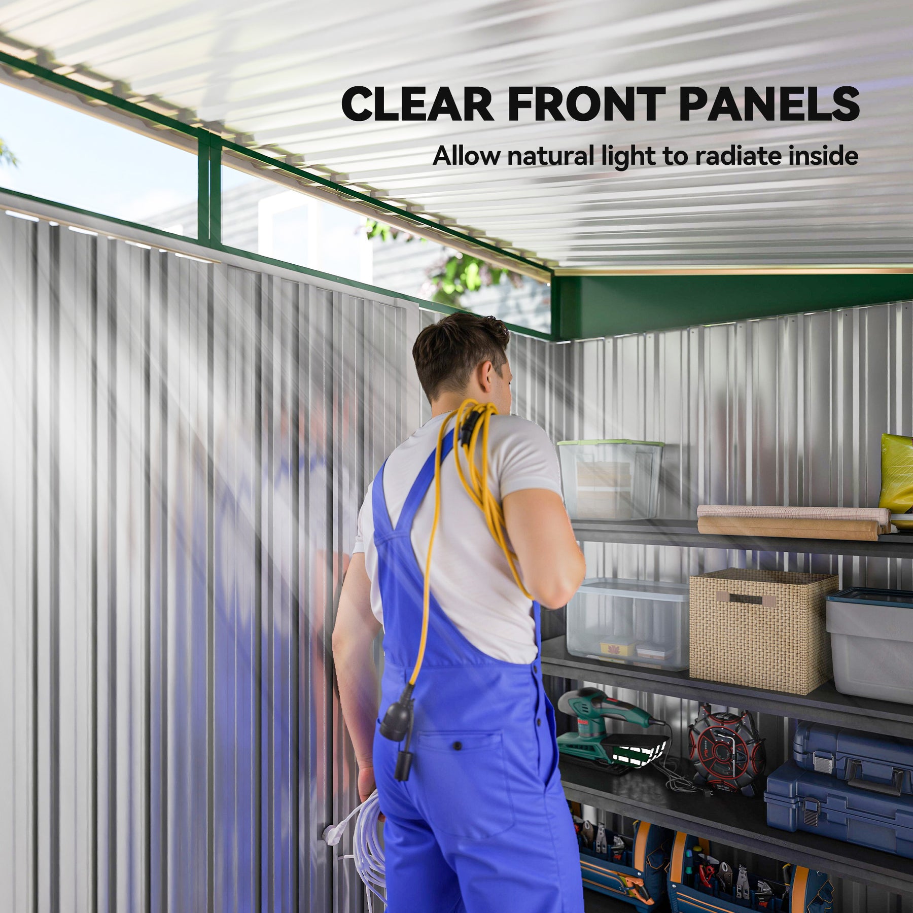 This MCL outdoor storage shed is a safe and protective way for keeping tools, equipment and outerwear stored. This corner garden shed is also spacious enough as a bike storage shed for the outdoor adventurers. Made from corrugated steel, the galvanised shed is strong, fitted with a sloped shed to prevent rainwater building up. Two clear front panels allow sunlight to drench through - outdoor sheds easy to see inside. Complete with two lockable sliding doors to enter and leave with ease.