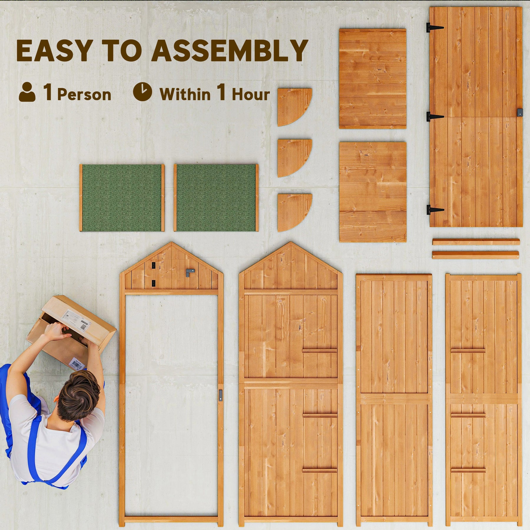 The backyard storage shed from MCL is an ideal solution for organizing all your garden tools and equipment. You can place small items on 3 shelves and store bigger tools in the larger area. This vertical storage shed is made of durable pine wood and cedarwood for a sturdy and strong construction. The wooden surface covered with waterproof paint and the roof with asphalt help provide added protection outdoors. The tool cabinet is designed to be an elegant and practical addition to your garden.