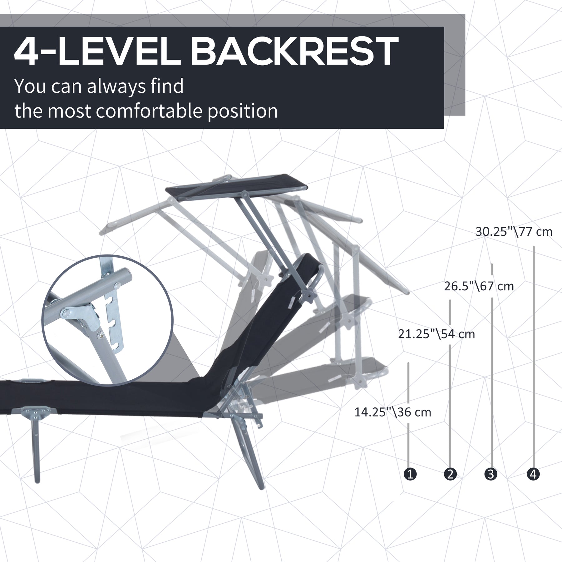 MCL Outdoor Foldable Sun Lounger, 4 Level Adjustable Backrest Reclining Sun Lounger Chair with Angle Adjust Sun Shade Awning for Beach, Garden, Patio, Black