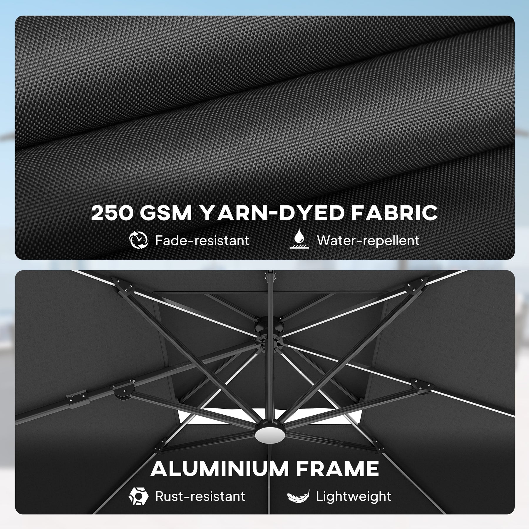 This cantilever parasol with base included combines style and practicality perfectly! The solar-powered LED lights emit a warm white glow, creating a cosy ambiance as the sun sets. The UPF 50+ canopy provides excellent sun protection, while the tiltable design and 360° swivel keep you cool from every angle. Plus, the long strap secures the canopy for easy, compact storage. Relax outdoors in style with this must-have garden companion!