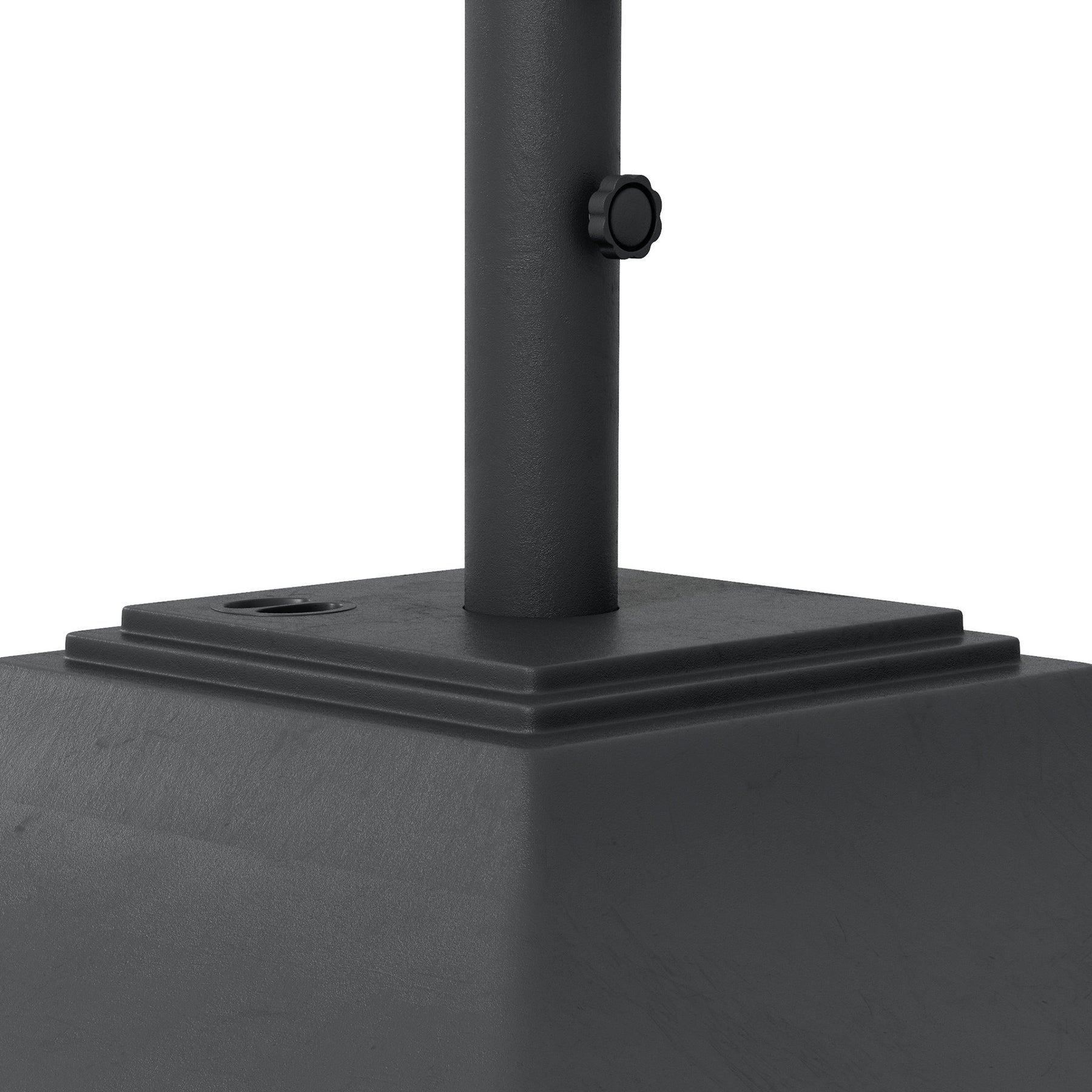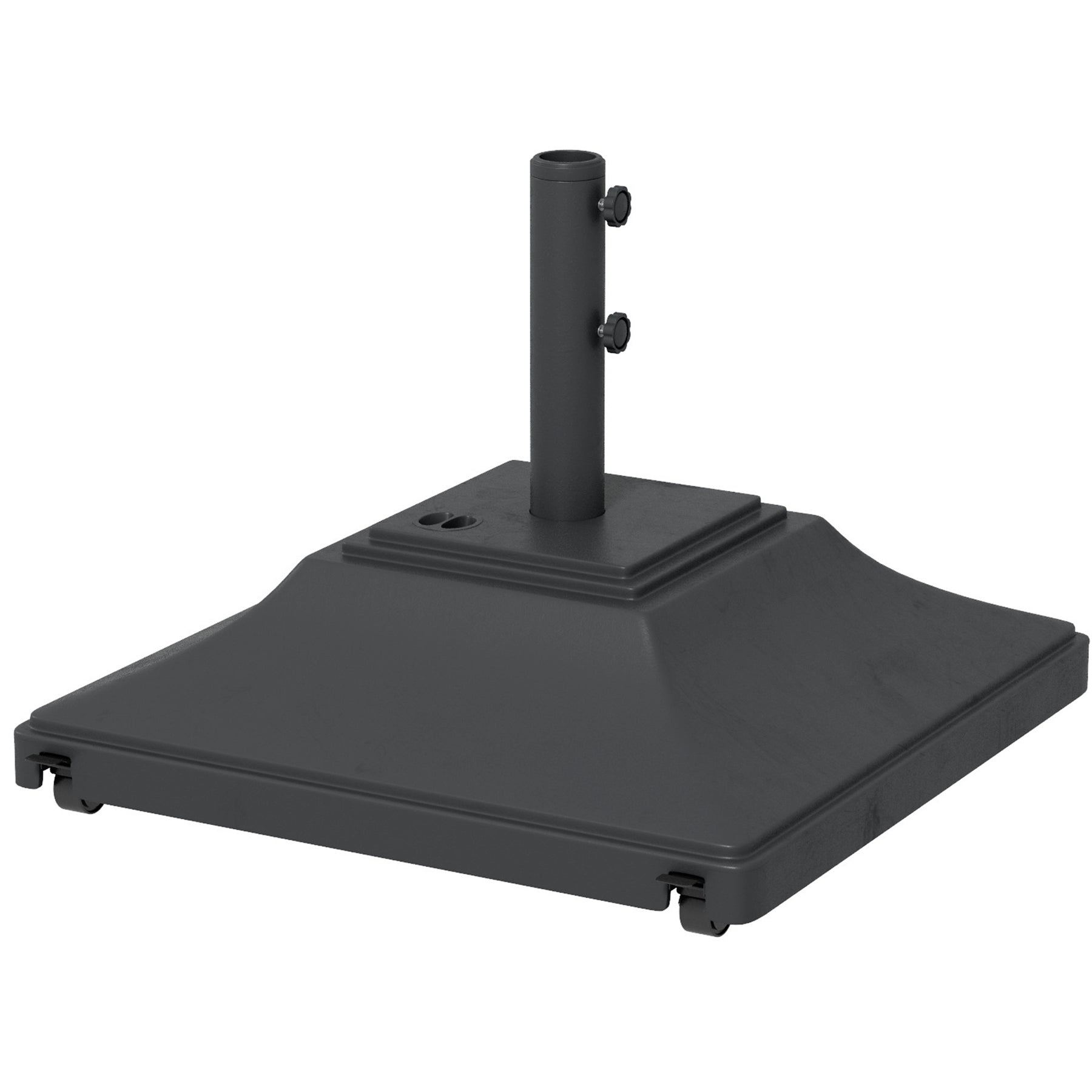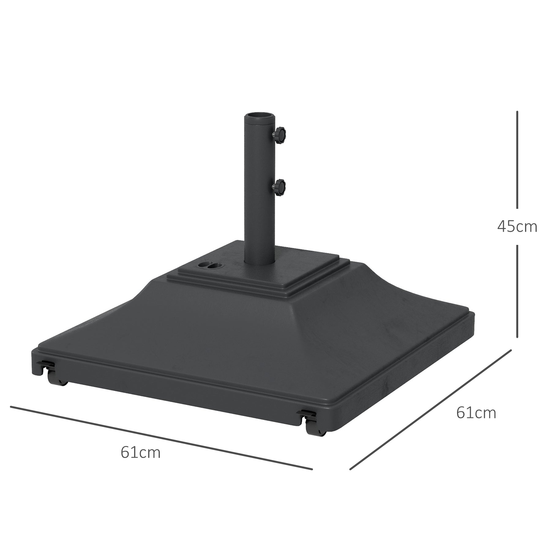 Keep parasol umbrellas firmly held in place: look to this patio umbrella base. Made from strong HDPE plastic, this is durable piece, resistant to light wear-and-tear. It's fitted with four wheels to roll easily when full. Fill with 45kg water or 60kg sand for plenty of weight. A powder coated steel pole for the parasol, complete with tightening screws to secure in place.