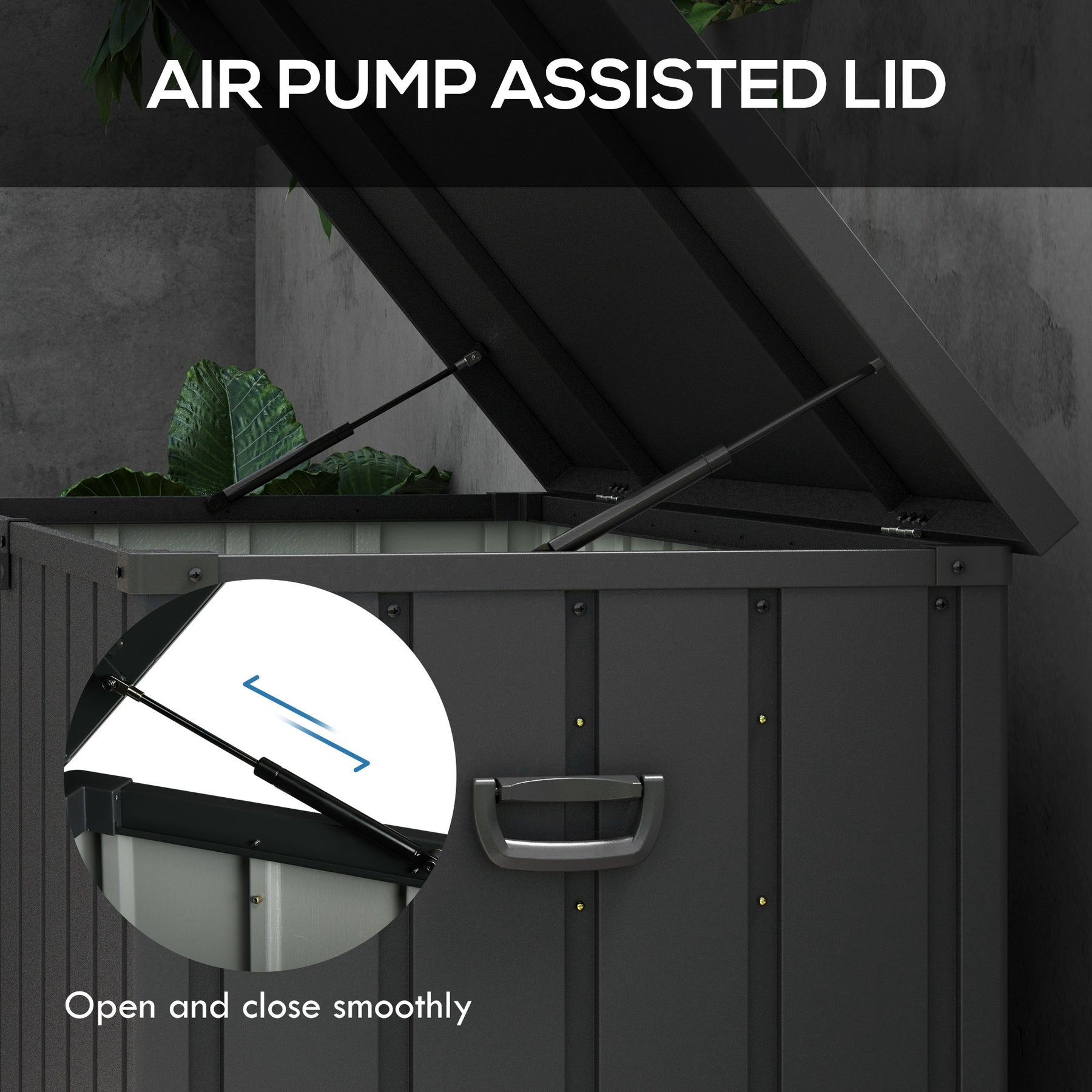 Tough metal outdoor storage comes in the form of this lockable garden storage box. The 450L capacity offers plenty of holding room for furnishings, garden accessories, tools and more. Made from thick steel, this waterproof storage box is strong, with an air pump on the lid for smooth, easy opening and closing. It comes with two handles and four wheels so you can move it around easily, whether empty or full.