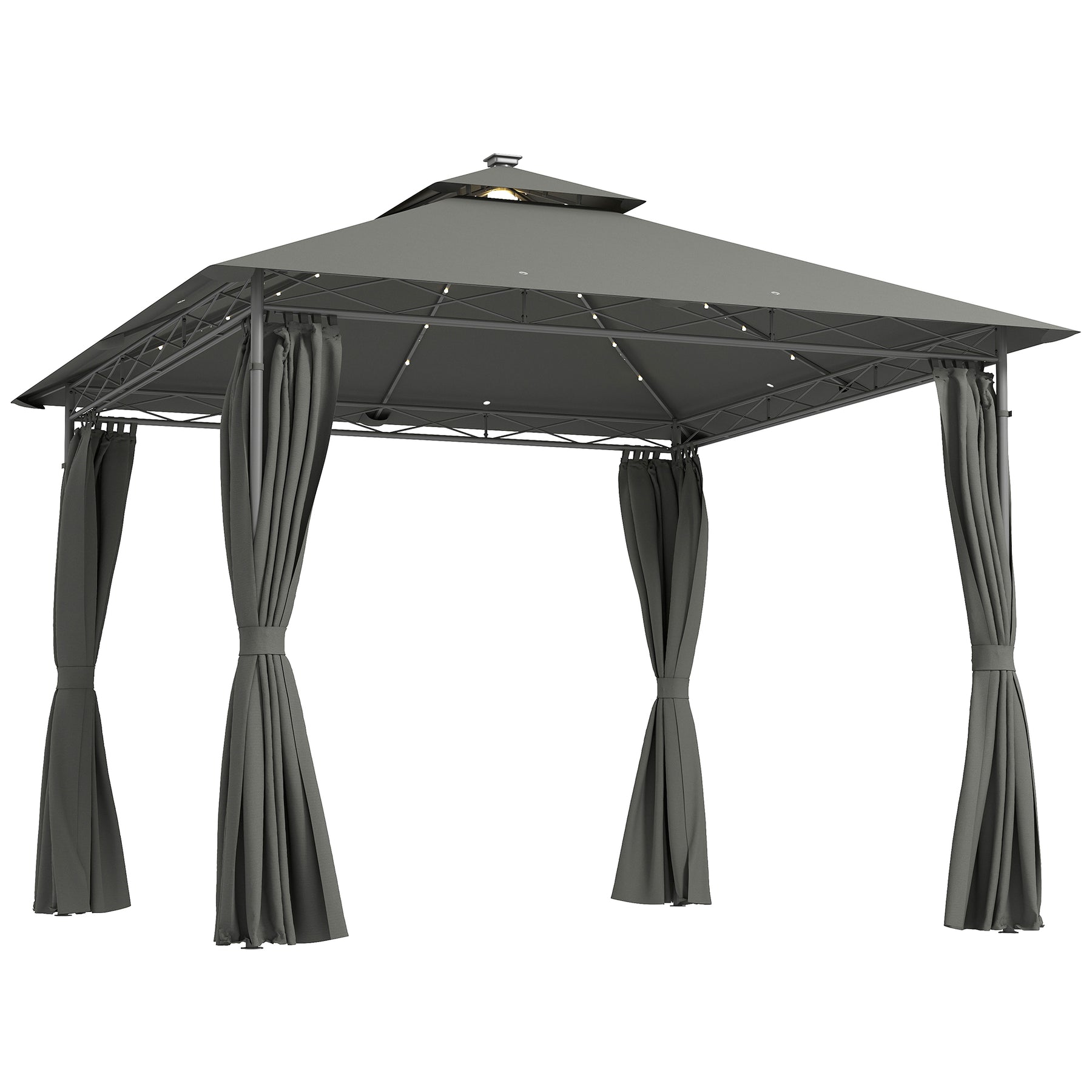 From day to night, this garden shelter is here to bring all your favourite people together. It's fitted with solar-powered LED lights: charge under the sun to use at night without any electric required. The two-tier splash-resistant canopy allows air out, with grommet holes so rainwater doesn't build up. Complete with removable curtains to create an open or closed atmosphere easily.