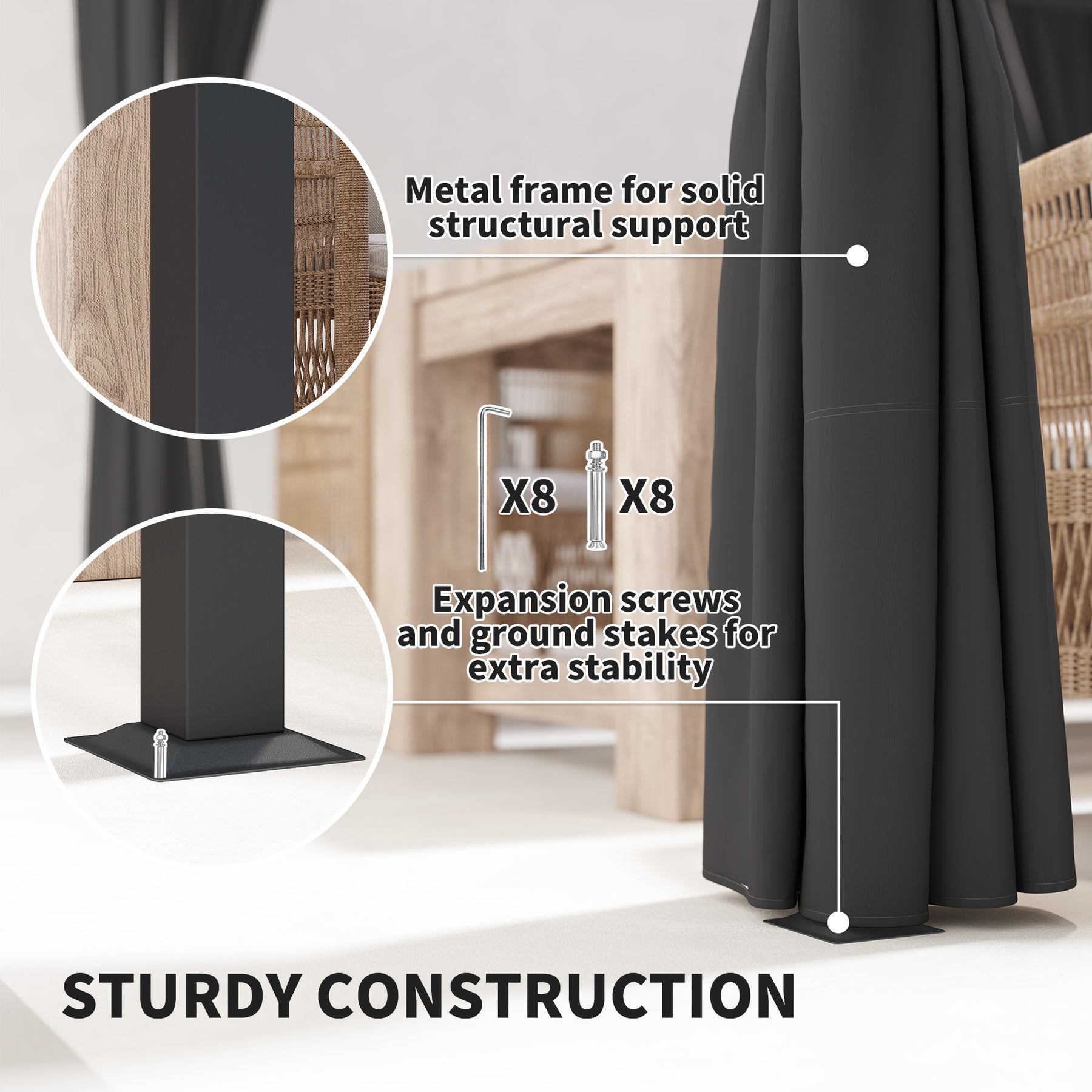 - 16x ground stakes and 8x expansion screws included to pin to the ground