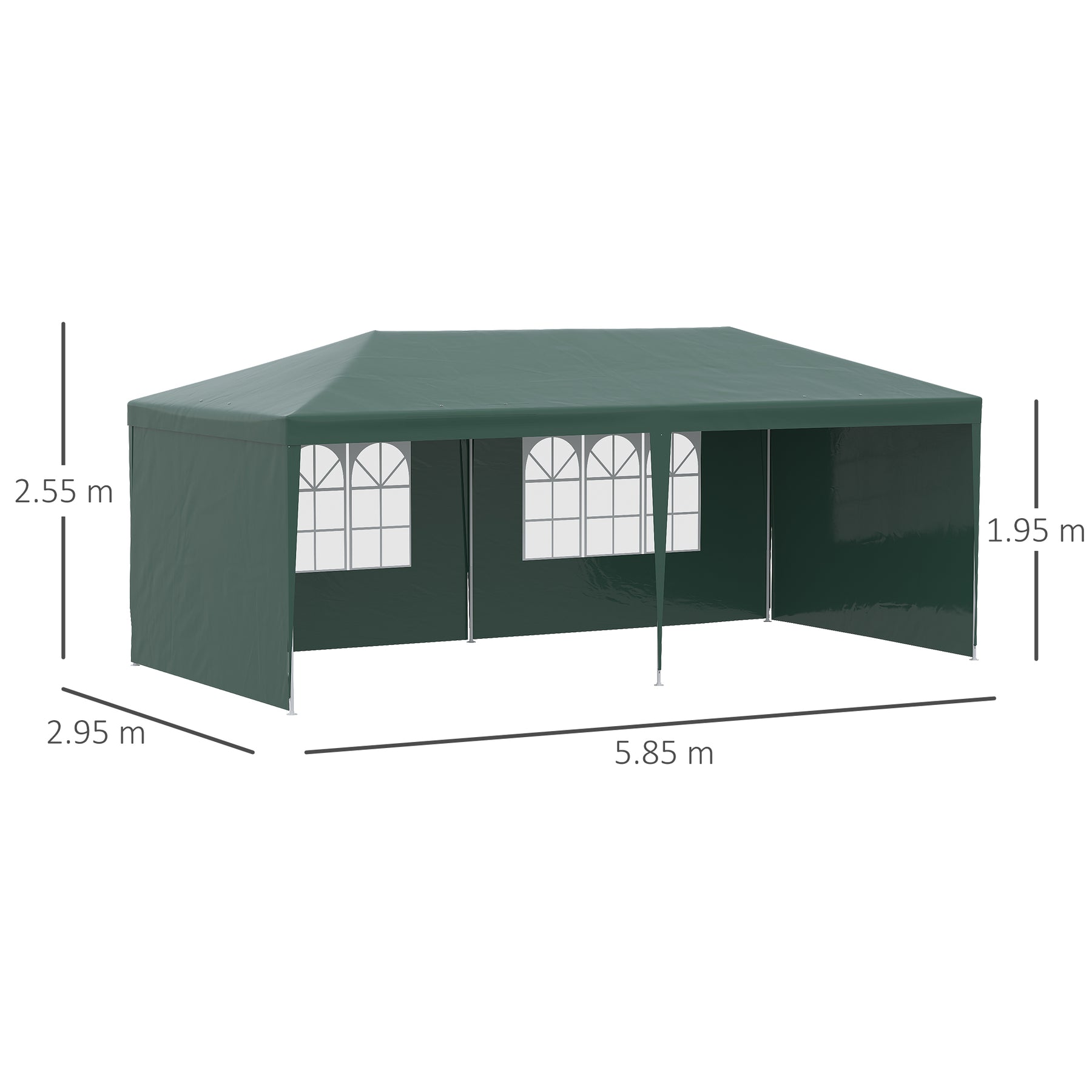 This marquee gazebo with sides is shelter when entertaining guests outdoors. It's formed of a steel frame for a tough structure, with a durable plastic canopy roof and side shell - there is no front for an open feeling. Six guy ropes and 12 ground pegs are included to make the party gazebo pin to the ground for extra stability. For many events like BBQS, family parties, wedding receptions, BBQs and more. Finished with handy adjustable feet.