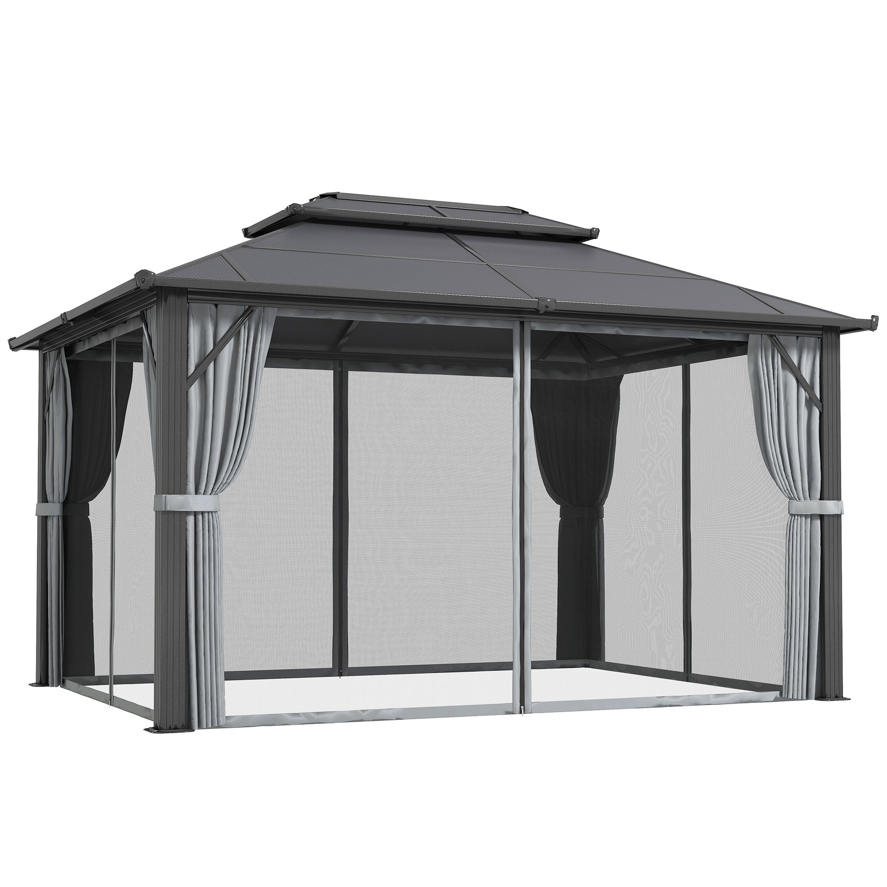 Transform your garden into a haven with the polycarbonate gazebo. Featuring 6mm thick polycarbonate panels, this waterproof gazebo shields you from UV rays while keeping you cool with its clever two-tier airflow design. Stop the sun at any angle and get rid of unwanted winged guests with curtains and nettings. Enjoy a serene outdoor shelter with sides, great as a heavy-duty, permanent fixture for any patio.