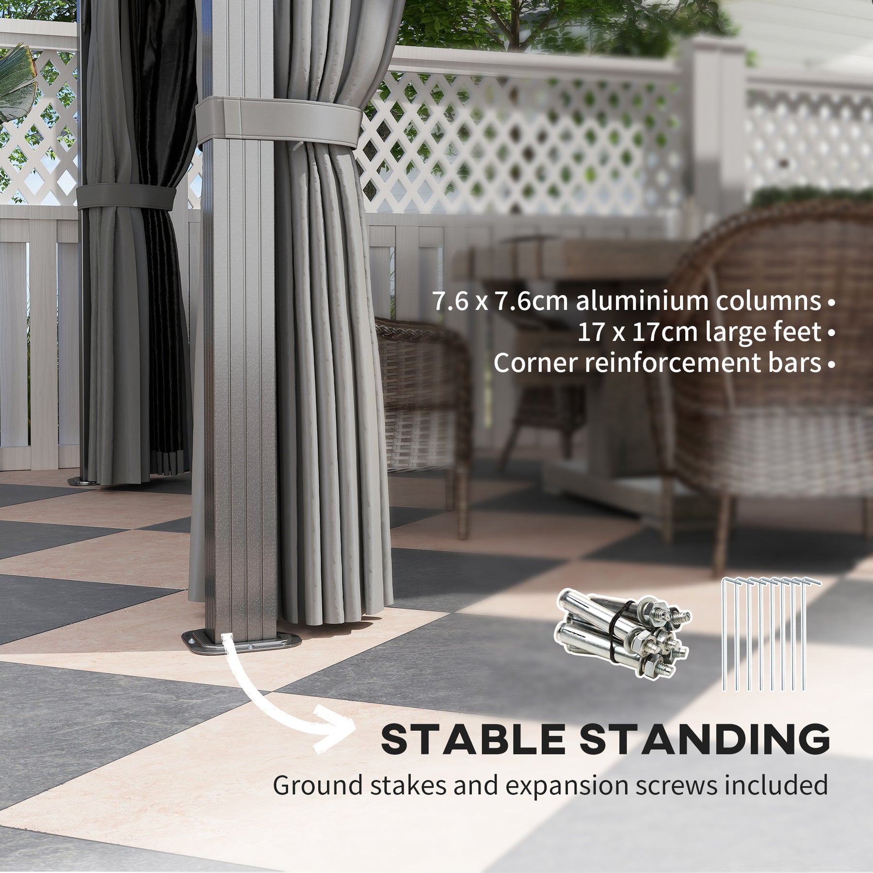 - 7.6 x 7.6cm aluminium columns, 17 x 17cm large feet and corner reinforcement bars for unmatched stability