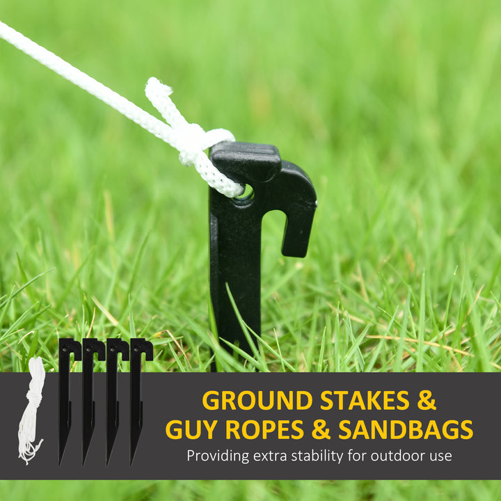 • Four ground stakes, two guy ropes and two sandbags to stabilise to ground