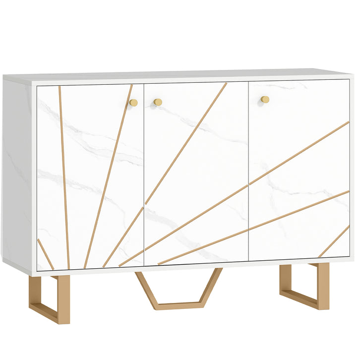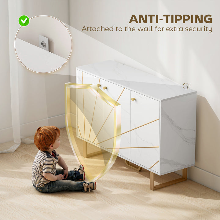 Elevate your space with the HOMCOM kitchen storage cabinet, where modern luxury meets functionality. Adorned with a chic marble texture and glamorous gold-tone legs and handles, this sideboard combines style with practicality. It features spacious cabinets, including a large double-door and a smaller single-door, each housing a 3-level adjustable shelf to cater to your storage needs. Add a touch of sophistication to any room!