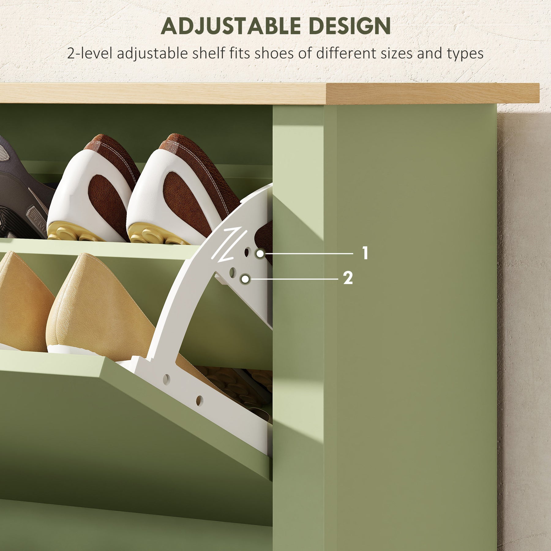 This compact shoe cabinet from HOMCOM will help to keep your home effortlessly decluttered. A particle board construction ensures a tough and solid frame, with a smooth coating so it can be cleaned easily. Each drawer features a two-level shelf - holds up to 6-12 pairs of shoes. Groove handle to open and close easily. Complete with a flat tabletop for extra holding and display space, with feet to keep the unit balanced.