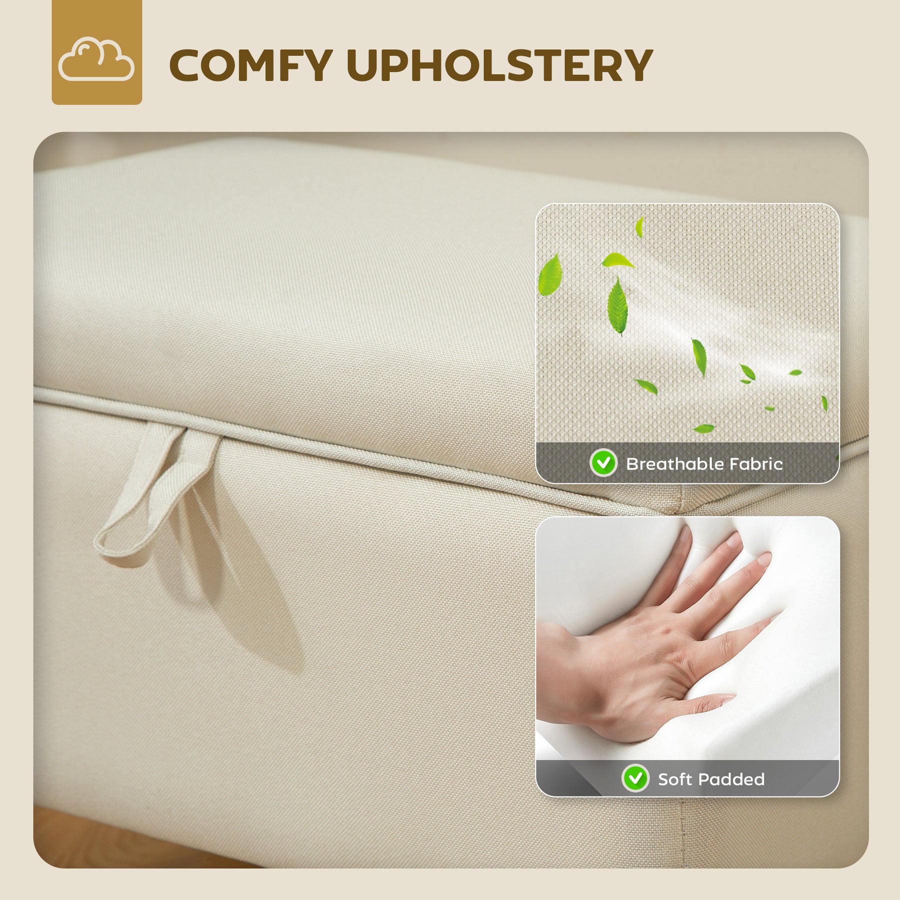 - Lid top is padded so you can sit on it comfortably. Linen-look upholstery is smooth