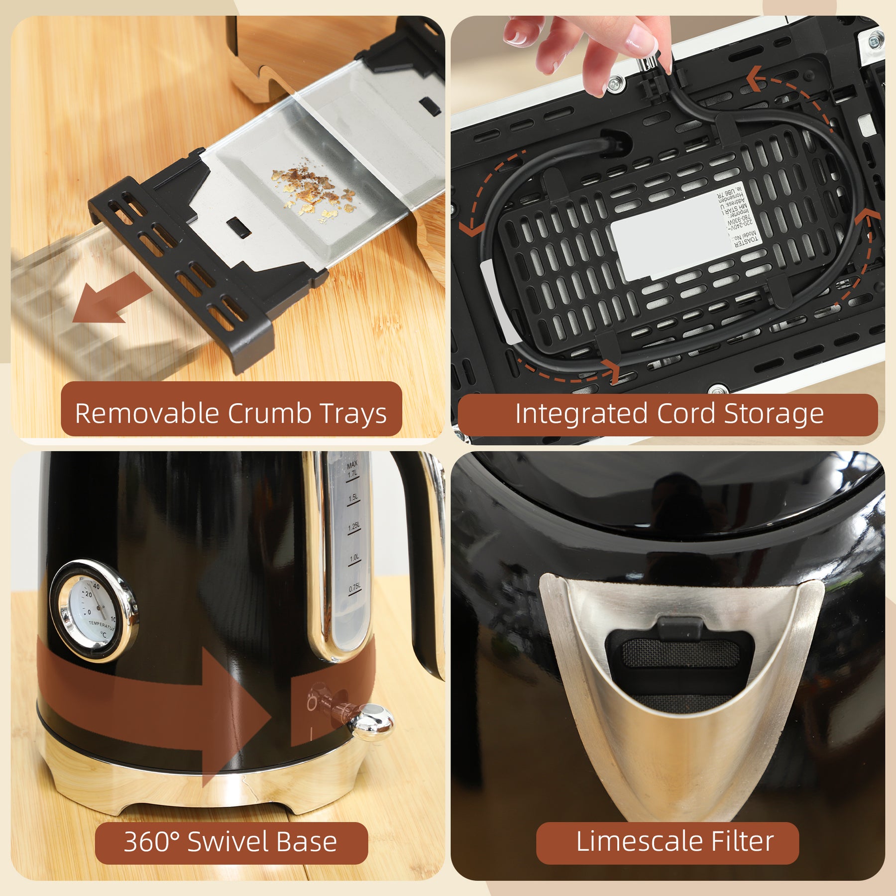 Take mornings back in time, with this HOMCOM toaster and kettle set. The solid black colour and silver-tone accents merge with the super-curved shape for a retro look - a statement piece for countertops. The 1.7L capacity of the kettle boils enough water for seven cups, so the whole family can enjoy a hot beverage at once. The two-slice toaster has seven browning levels and defrost/reheat/cancel functions.