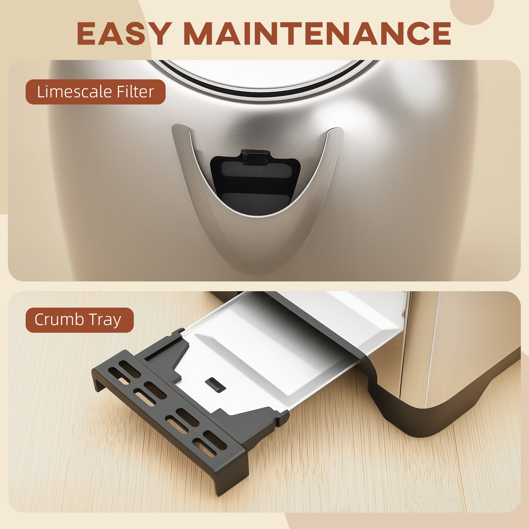 Sleek style for the countertop, with this HOMCOM toaster and kettle set. In silver tone, with polished metal accents - a simple design which complements your current small appliances. The LED strip glows for a touch of ambience when working. The 1.7L kettle capacity boils enough for seven cups; with an Otter thermostat to deliver fast and precise boiling with safety features. And thanks to the seven browning levels on the two-slice toaster, it's easy to enjoy your food your way.