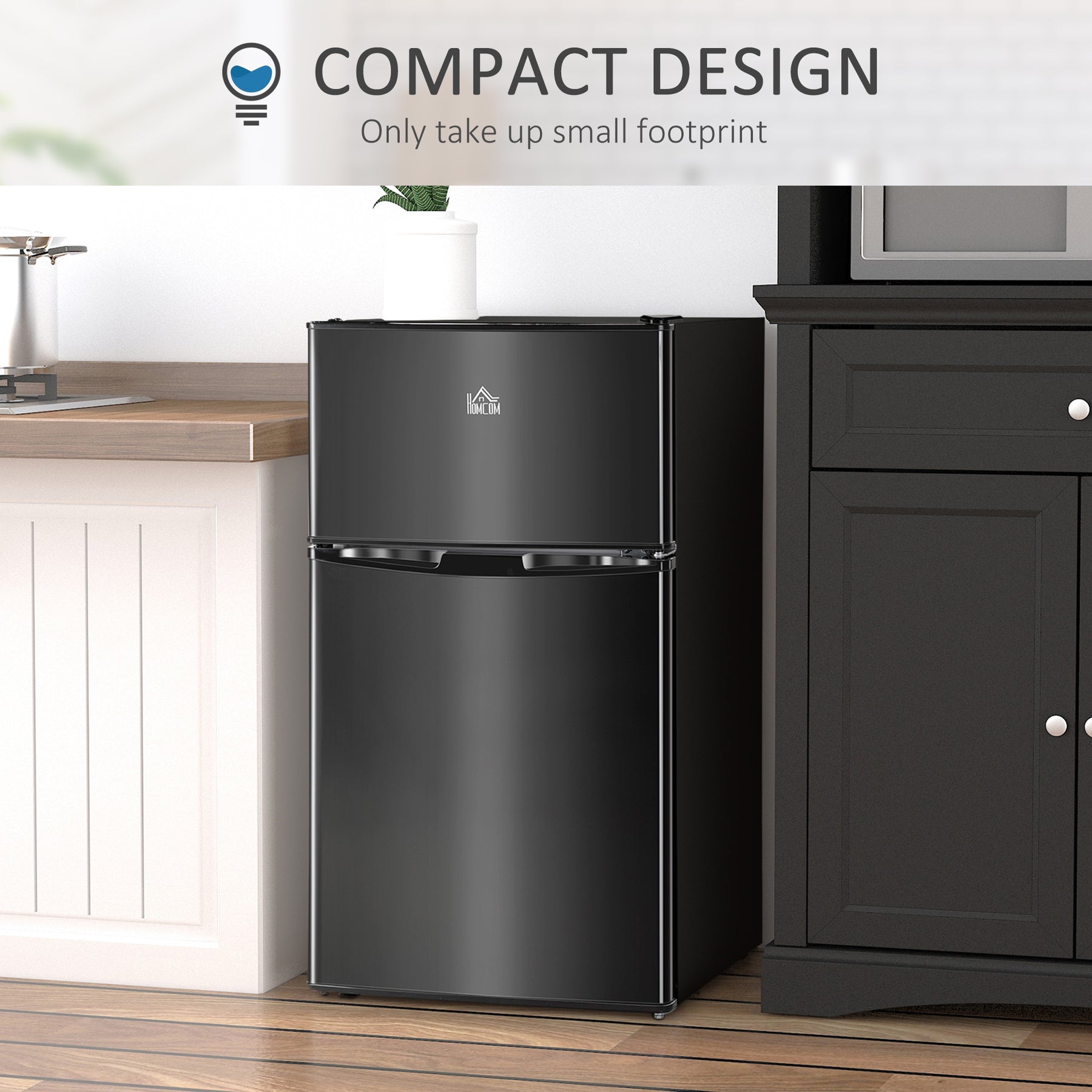 Even small spaces can accommodate fresh food with this HOMCOM under counter fridge freezer. Combining a 25L upper freezer and 63L lower fridge, you can safely store plenty of food and drinks. With two removable shelves, a crisper drawer, door racks and reversible doors, you have full control over how you use this fridge. Low-power and quiet under counter fridge — efficient and unobtrusive for any room.