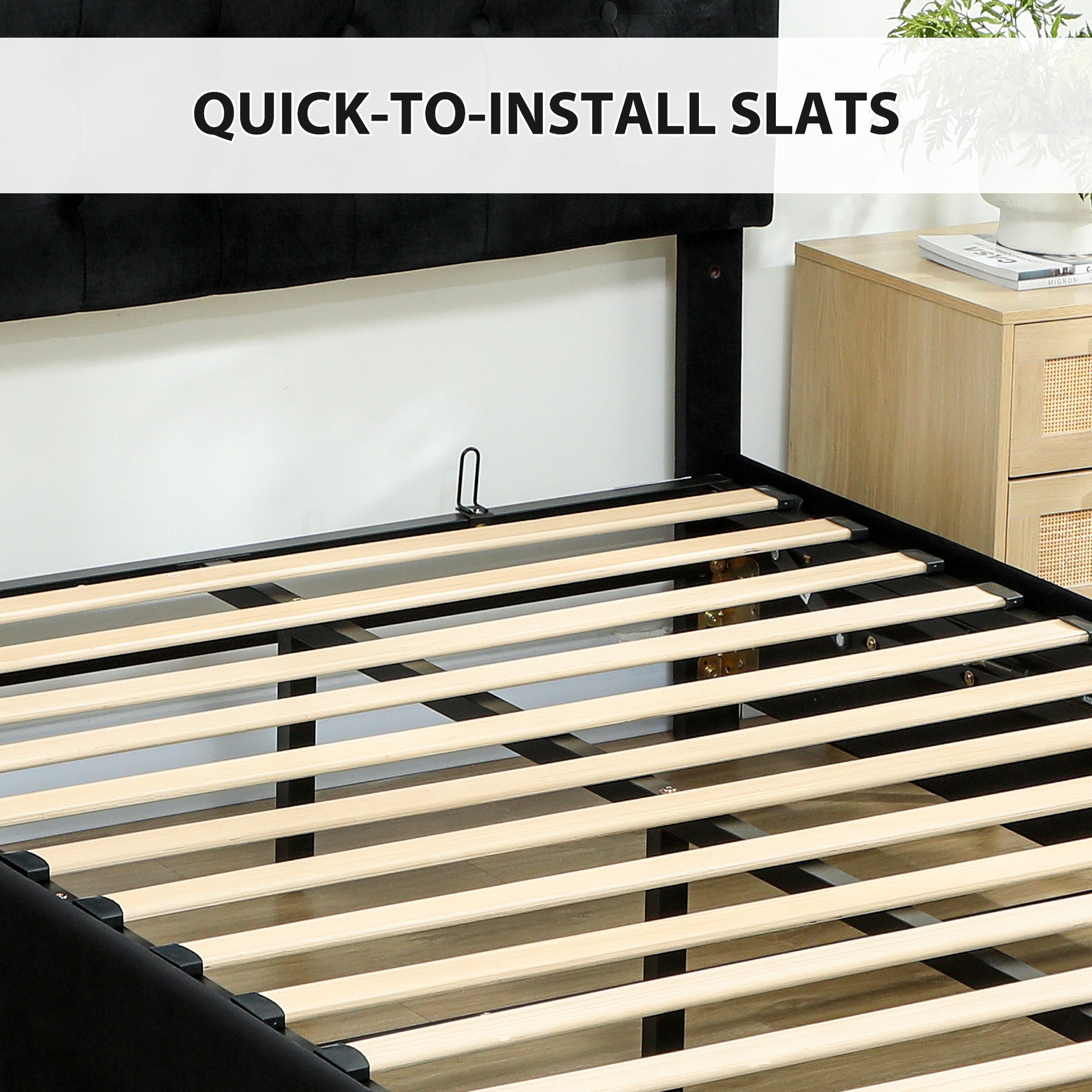- Wooden slats included to hold mattress level and in place