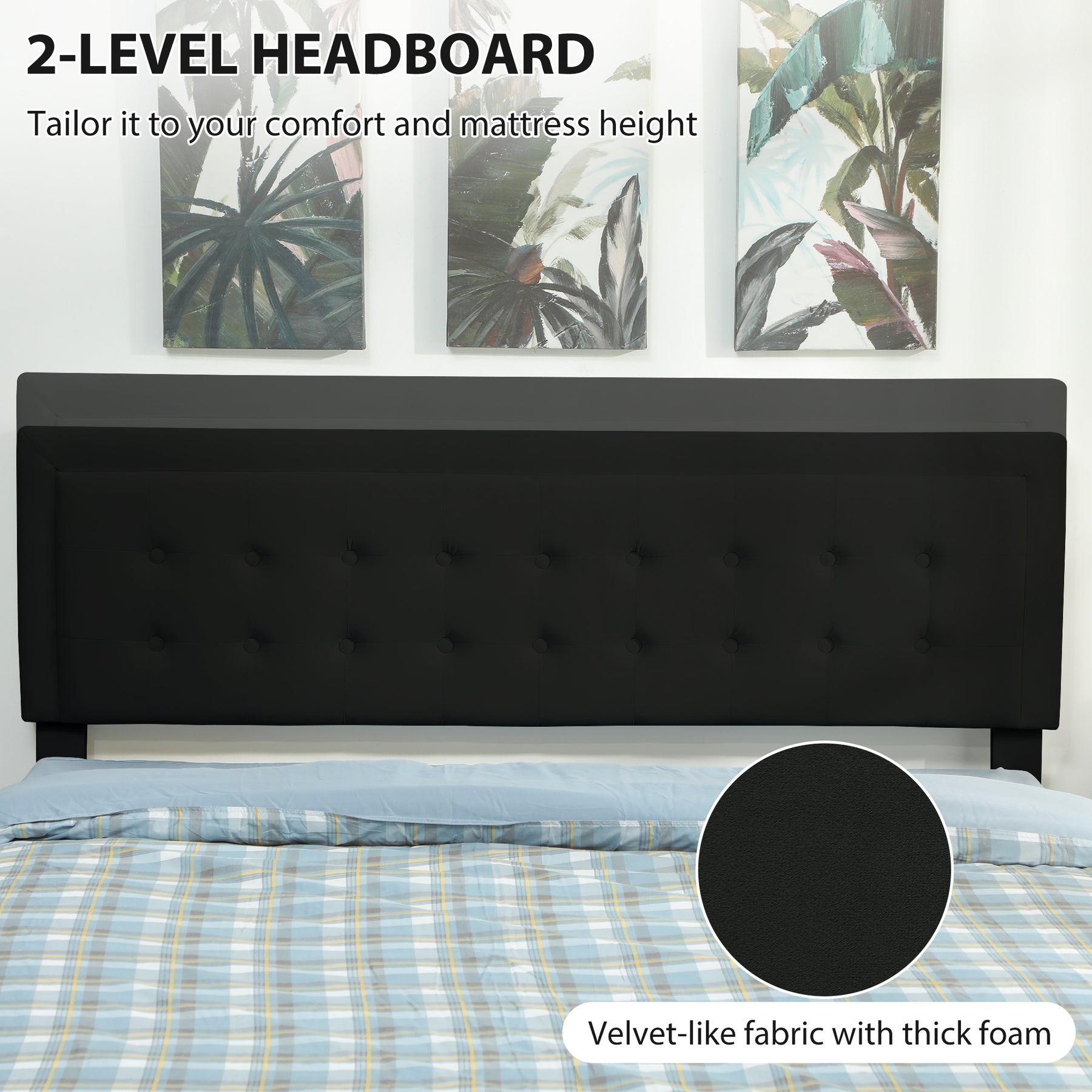 - Velvet-feel headboard can be fixed to two different levels