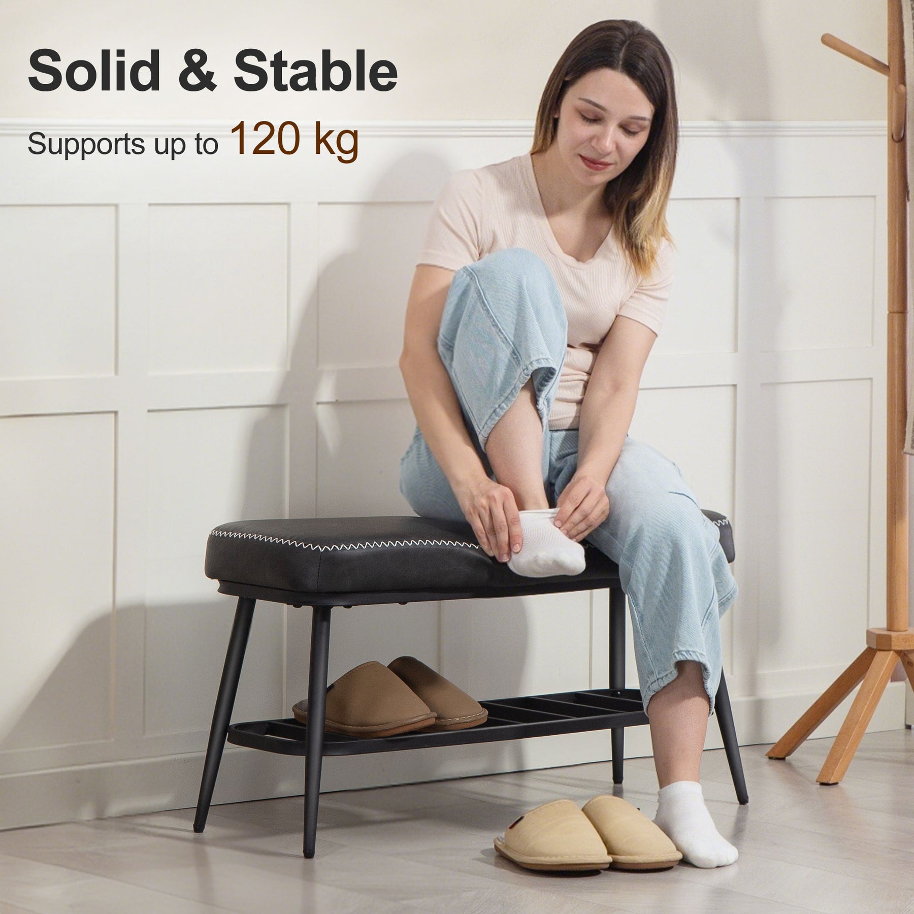 • Bottom storage shelf neatly holds four pairs of shoes, decluttering your entryway