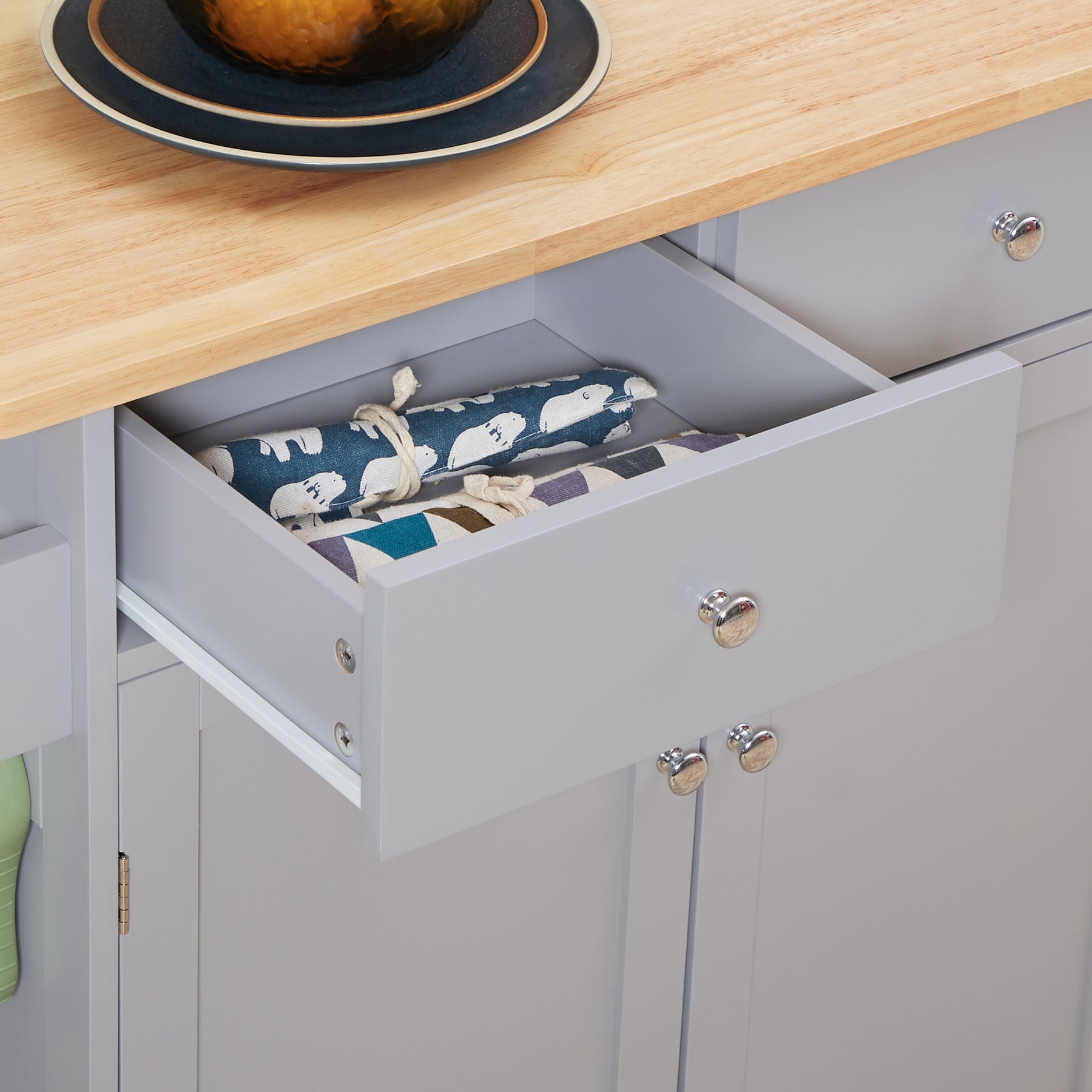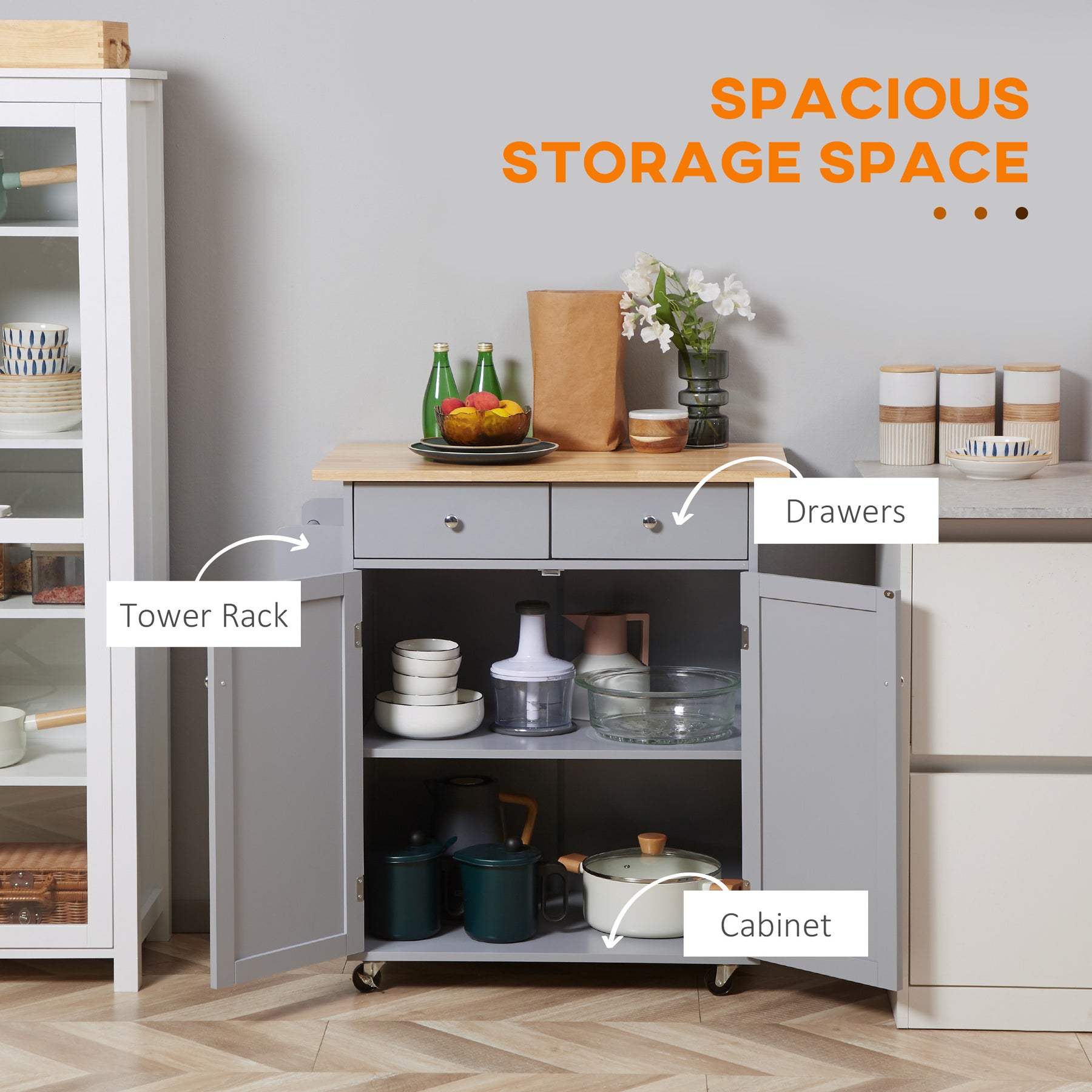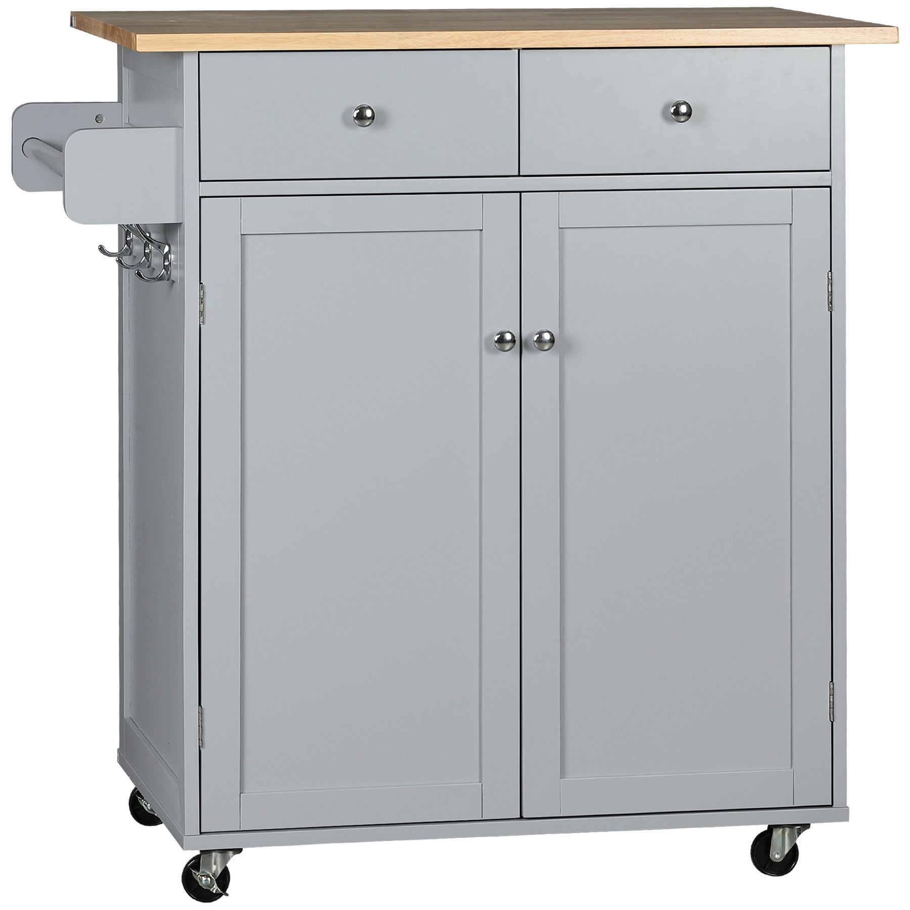 MCL Rolling Kitchen Island on Wheels, Utility Serving Cart with Rubber Wood Top, Towel Rack, Hooks and Storage Drawers, Grey