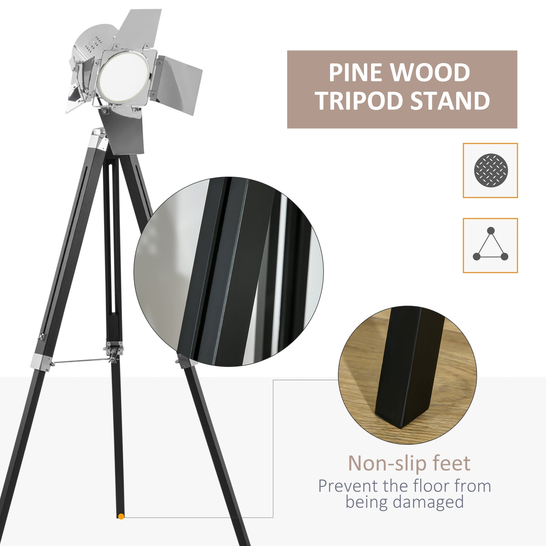 MCL Industrial Tripod Floor Lamp, Nautical Cinema Standing Spotlight with Wood Legs and Adjustable Height for Living Room, Bedroom, Black and Silver