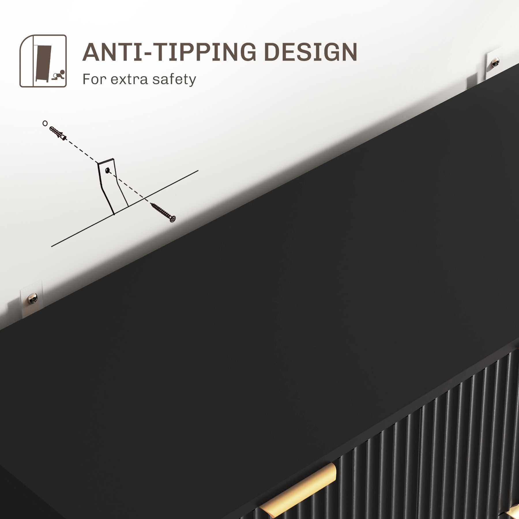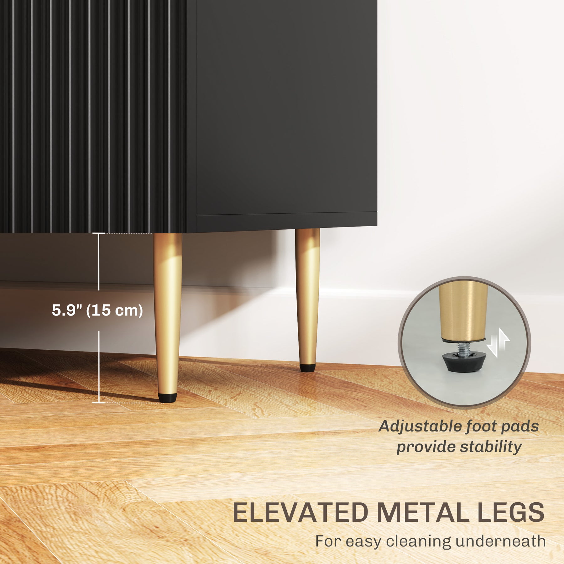 - Metal legs, gold tone handles and fluted panel design give it a modern look