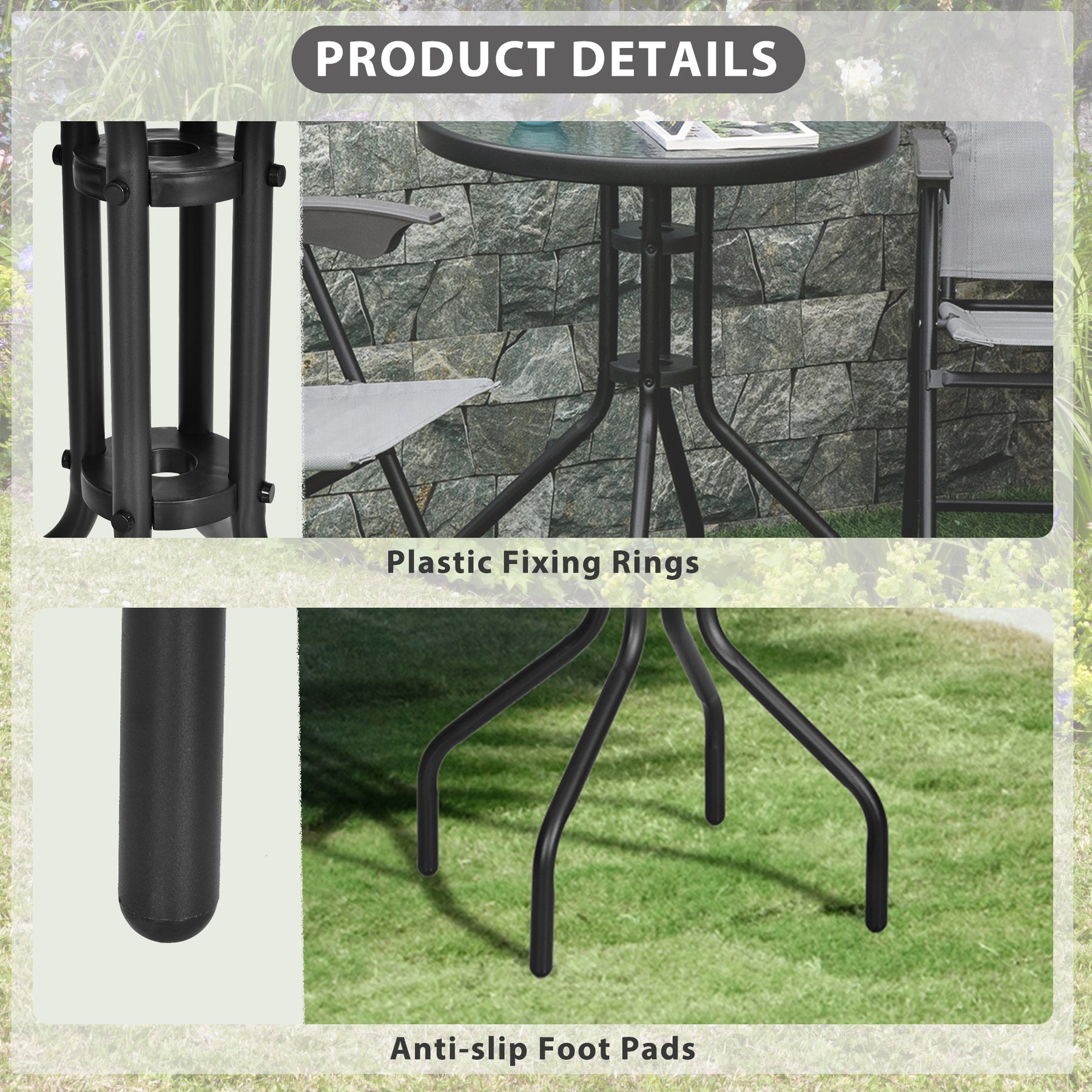 • 5mm tempered glass tabletop without umbrella hole