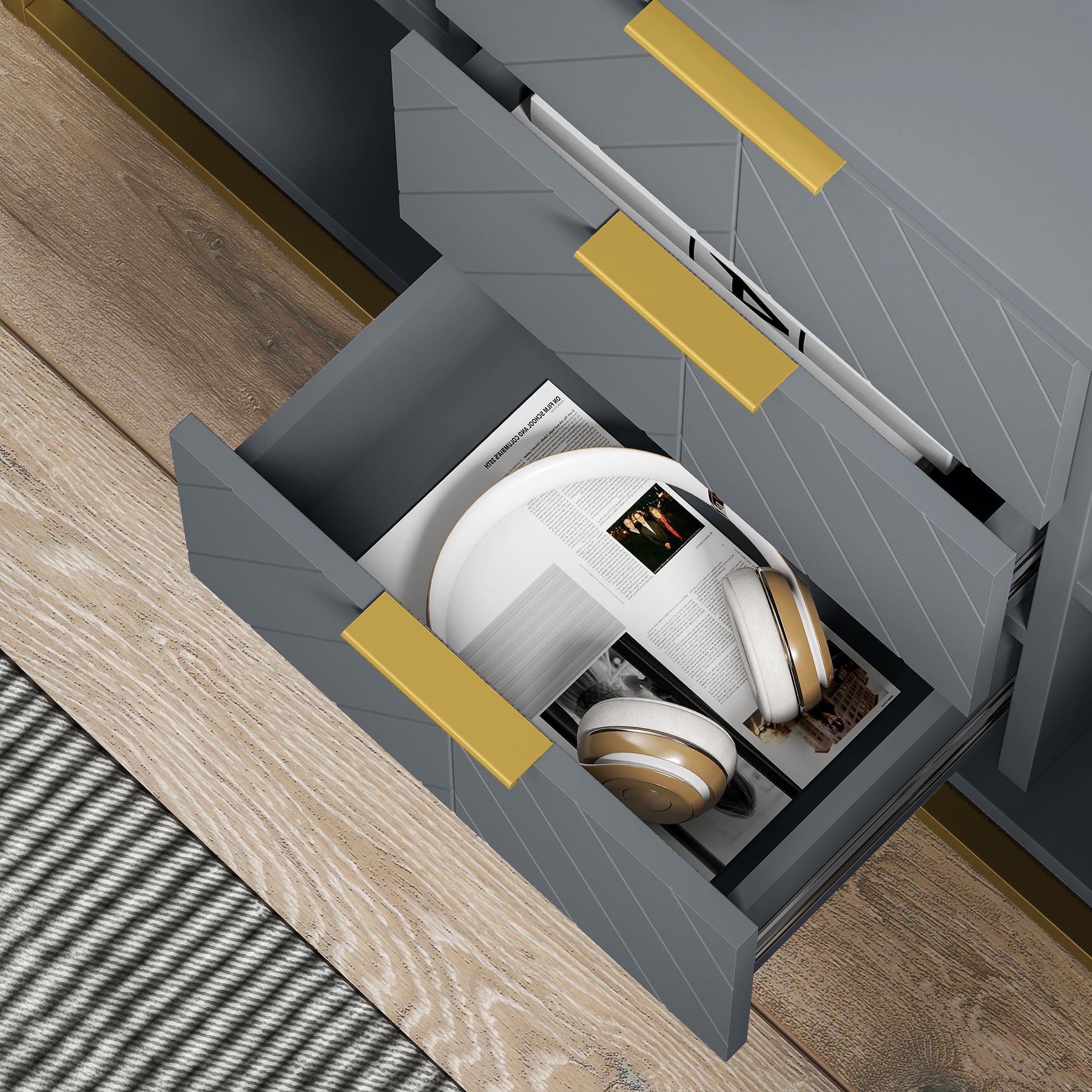 - Sleek living room cabinet with luxurious gold tone base and hardware accents will perfectly match your inner styling