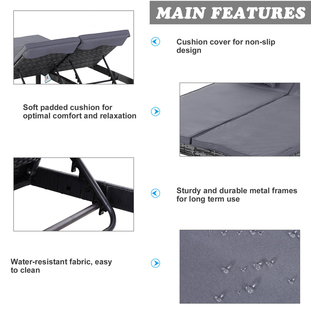 - Longline padded cushion on top of each lounger, with tie fastenings to keep in place
