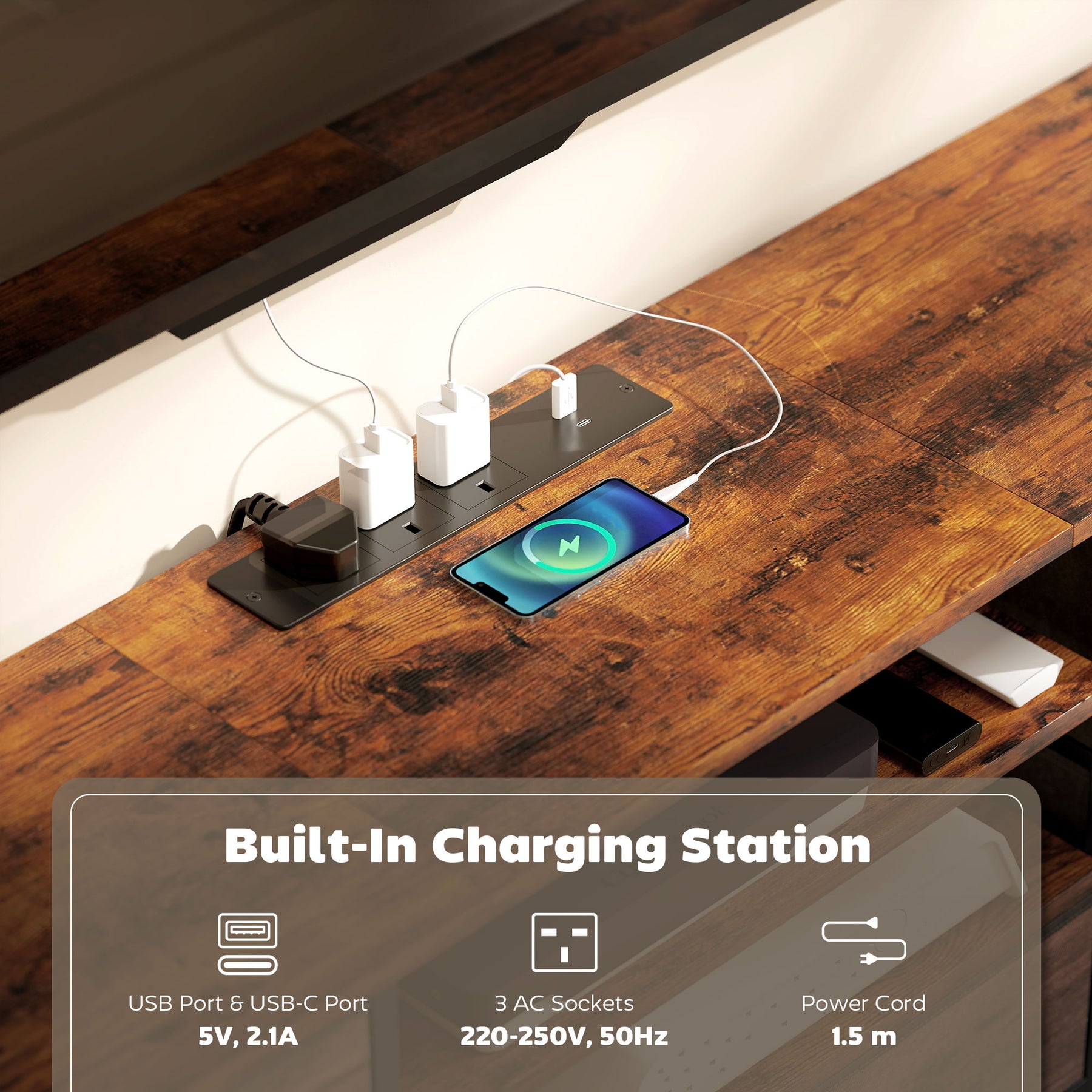 - Three AC sockets and two USB ports are built in. Keeps devices powered at all times. No messy wires everywhere