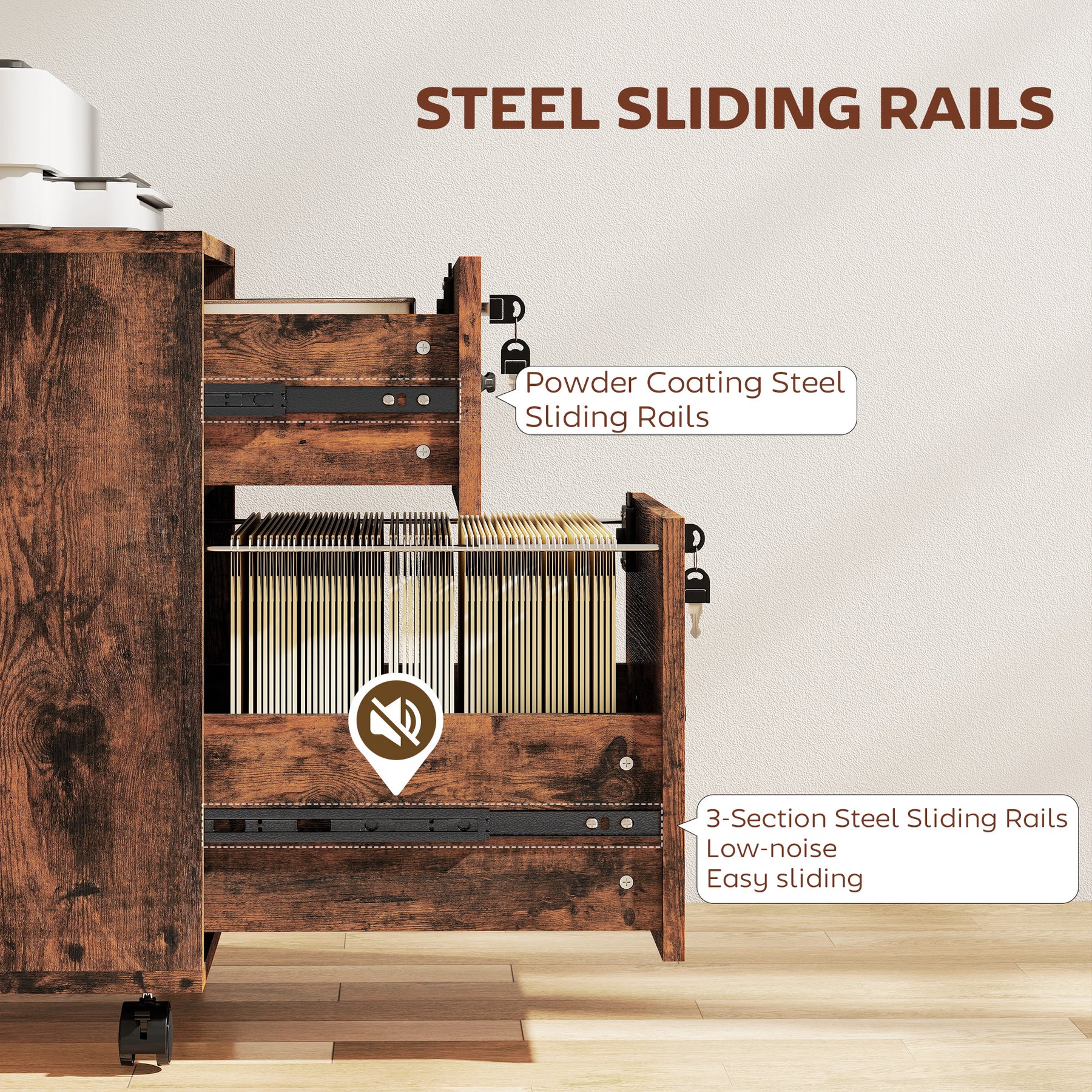 - Lower drawer features hanging rail for letter-sized files
