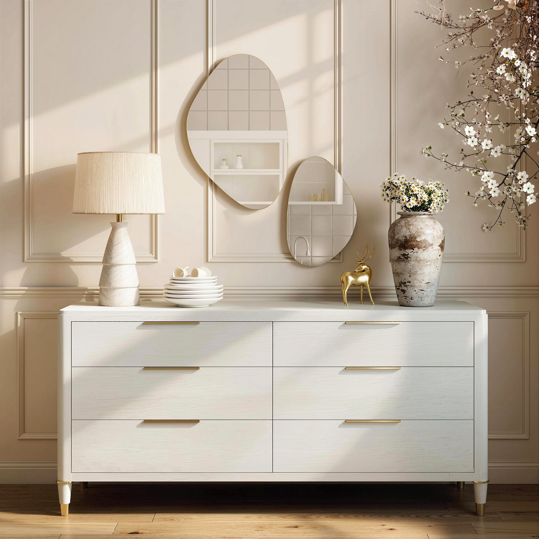 Tired of blank walls that lack personality? Finding decor that's both striking and long-lasting can be a challenge. Elevate your space with the living room mirror set. Its unique pebble-shaped design sparks conversation, while the reliable metal frame and MDF construction ensures lasting durability. This coordinated duo brings artistic harmony and modern elegance to your home, reflecting your distinctive taste in every glance.