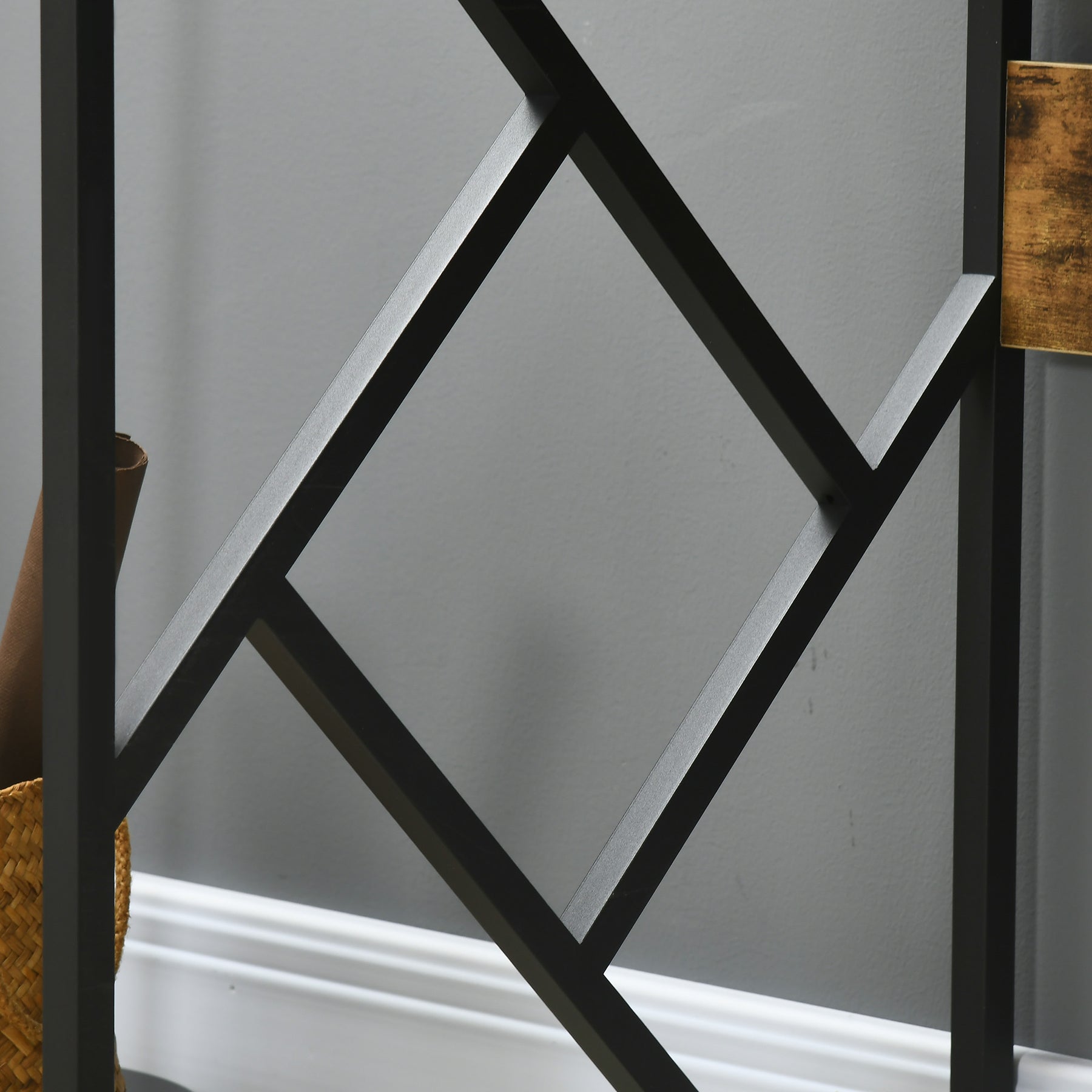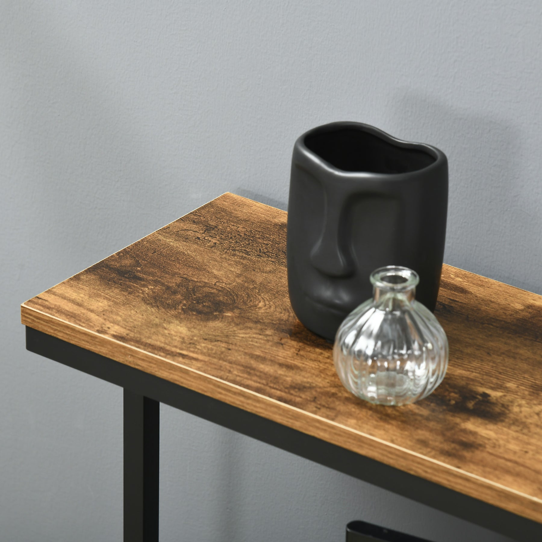 • Rustic wood grain pattern and black metal frame enhances an industrial style