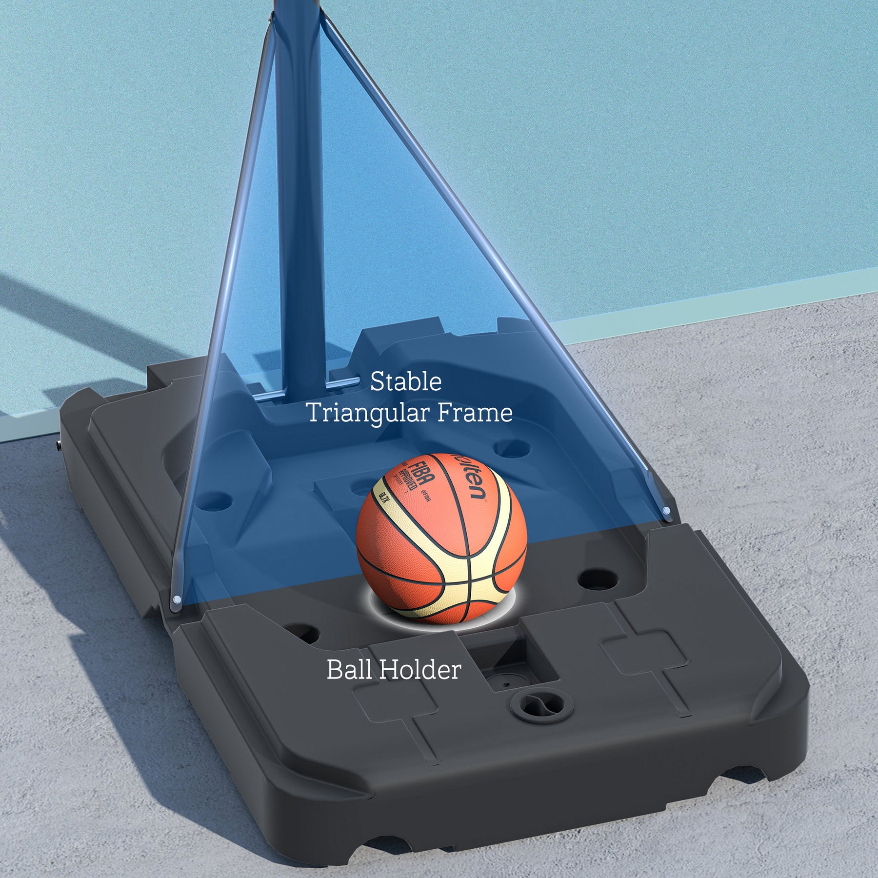 Fancy a game of basketball? Get everyone involved with this SPORTNOW portable basketball hoop! With an adjustable height of 160-305cm, it's great for all ages and heights. Just fill the base with water or sand to keep it stable and balanced. Its shatter-resistant backboard and dual-spring rim are ready for intense sessions. Plus, wheels at the bottom make for easy movement, so you can set up anywhere for thrilling games of shooting hoops!