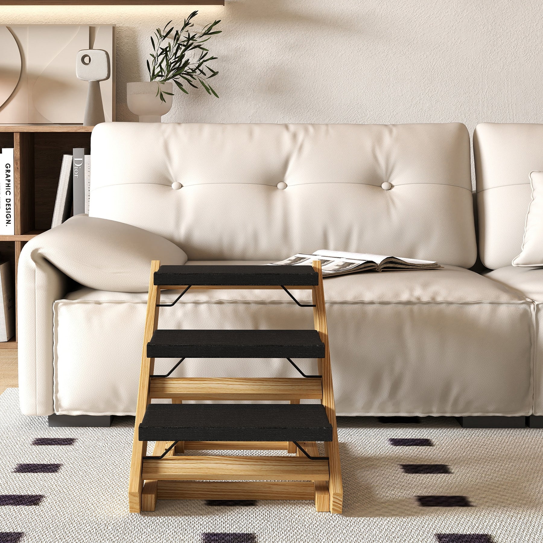 Discover the versatility of Dog Steps, a clever 2-in-1 design that serves as both cat steps and a ramp. Crafted from pine wood, it supports your four-legged friends safely, making it suitable for older or injured pets. With adjustable heights, the cat stairs easily accommodate beds, sofas and other furniture, ensuring comfy access for your furry friend. Plus, it's foldable for easy storage!