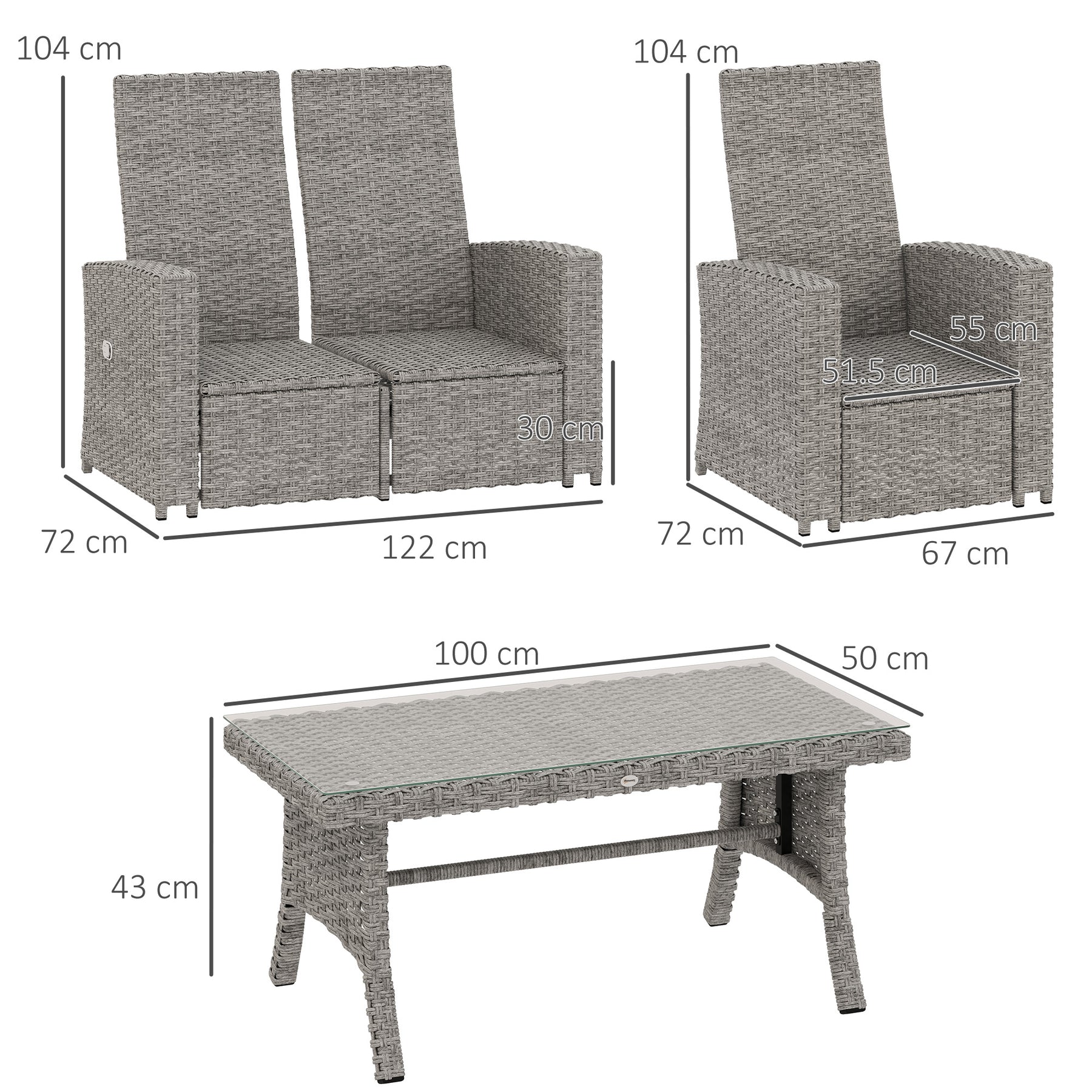 An inviting outdoors, this season and beyond: say hello to this rattan furniture set. All pieces have a galvanised steel frame for a strong core, wrapped in plastic wicker for double the durability-and style, of course. The two armchairs have 90°-135° reclining backs-extra relaxing points scored! Seat and back cushions for comfort. Complete with a glass-top coffee table.